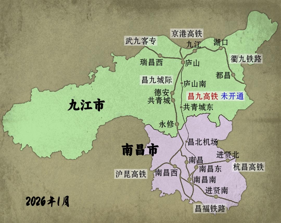 九江、南昌高铁图 九江、南昌之间目前只有一条昌九城际铁路 在建昌九高铁是京港高铁的一部分
