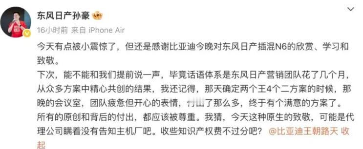 【比亚迪被指抄袭?】日前,因比亚迪在新车2026款秦L DM-i发布会上使用了“两王+四个2”的宣传文案而被指抄袭,原来在此前东风日产N6的发布会上,也曾打出类似的文案,因为宣传语类似,而受到了东风日产孙豪的吐槽,其表示:有点被小震惊了,但还是感谢比亚迪今晚对东风日产插混N6的欣赏、学习和致敬。 这个事儿在我看来说“英雄所见略同”或许更合适,但如果说是抄袭其实有点争议,因为俩王四个二这种说法其实由来已久嘛,会玩儿斗地主的其实都知道,即使引入到车圈用来描述产品,也有其他品牌做过类似表达,其实不值得小题大做。 当然,目前新能源汽车市场竞争白热化,东风日产对比亚迪的文案做个吐槽,或许还有为N6博流量的考量,但不论如何,营销创意确实需建立在原创基础上,而车企未来的竞争则应聚焦于技术与产品硬实力。
