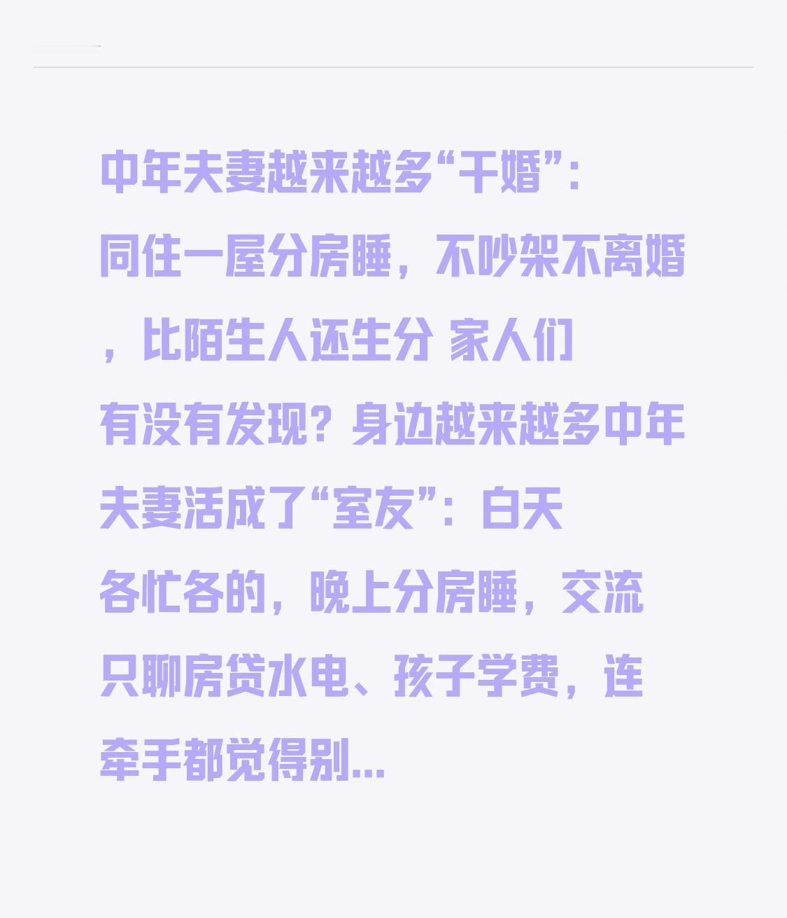 中年夫妻越来越多“干婚”:同住一屋分房睡,不吵架不离婚,比陌生人还生分 家人们有没有发现?身边越来越多中年夫妻活成了“室友”:白天各忙各的,晚上分房睡,交流只聊房贷水电、孩子学费,连牵手都觉得别扭,这种没感情、没亲密的“干婚”,正在悄悄蔓延,到底是为什么? 先给大家说个扎心的真相:数据显示,一线城市32%的已婚人群都在经历“干婚”,80后夫妻占了63%,35到50岁正是重灾区。上海一对夫妻的经历戳中很多人:结婚15年,房子500万买的还剩300万贷款,现在市值跌到450万,吵着要离婚,算来算去卖房的钱不够还银行,最后只能继续凑活住,分房睡了三年,见面只说“孩子家长会别忘了”。 第一个转折点来了:很多人以为“干婚”是因为没感情,其实更多是被现实绑住了手脚。经济压力首当其冲,现在离婚成本太高,分割财产、律师费、重新租房,一套流程下来少则几万多则几十万,尤其是房价下跌的当下,很多家庭“离婚即致贫”。还有孩子这个“软肋”,北京不少夫妻明明早就没感情,却硬撑到孩子高考结束,就怕单亲标签影响孩子升学、相亲,毕竟数据显示单亲家庭子女相亲歧视率高达20%。 更让人揪心的第二个转折:感情早就被生活磨没了,却连吵架的力气都没有。中年人的精力被职场竞争、老人养老、孩子教育榨干,一线城市夫妻日均工作10小时,回家只想躺平刷手机,日平均深度交流时间不足15分钟。以前谈恋爱时的甜言蜜语,现在变成了“水电费该交了”;曾经的相拥而眠,如今成了“你睡主卧我睡次卧”。有对夫妻坦言,他们三年没亲密接触,摸对方就像摸自己的左手右手,连一点感觉都没有。 第三个转折更现实:社会束缚和自我妥协。在小城乡村,离婚被当成家丑,公婆邻居戳脊梁骨,50后60后的父母觉得儿女离婚丢人,家族都抬不起头,这也是农村离婚率比城市低10%的原因。而对很多中年人来说,“干婚”成了最划算的选择:有人分担房贷房租,有人照顾家庭,不用面对离婚后的孤独和未知,哪怕情感上孤独,至少生活上稳定。就像呼和浩特一对夫妻说的:“月入不足9000,要养俩孩子还要照顾卧床老人,离婚了谁都过不好,凑活过至少有个完整的家壳子”。 但“干婚”的代价也很残酷:长期无性可能导致激素不稳定、性器官早衰,而情感上的孤独更伤人,很多人在婚姻里活成了孤岛 。更可怕的是,这种“凑活”的婚姻会影响下一代,孩子在没有温度的家庭里长大,容易对爱情和婚姻失去信心。 其实大家心里都清楚,婚姻的本质不是搭伙过日子,而是情感的共鸣和陪伴。那些坚持下来的幸福夫妻,都懂的在平淡中找仪式感:每月一次约会,每年一次旅行,哪怕只是睡前聊聊天,都能给感情充充电。就像北京一对结婚25年的夫妻,通过一起学国画重新找到话题,他们说:“画桌前说的话,比过去五年在家里说的都多”。 人到中年,婚姻确实会遇到各种难题,但“凑活”从来不是最好的答案。经济压力可以一起扛,情感疏离可以慢慢补,最怕的是明明过不下去,却因为害怕改变而将就一生。毕竟,我们结婚是为了有人分担风雨、共享阳光,而不是在同一屋檐下,过着最孤独的生活。 你身边有“干婚”的夫妻吗?如果是你,会选择凑活过还是勇敢改变?欢迎在评论区聊聊你的看法,点赞关注,咱们一起探讨婚姻的真相,愿每个中年人都能在婚姻里找到温暖,而不是将就!