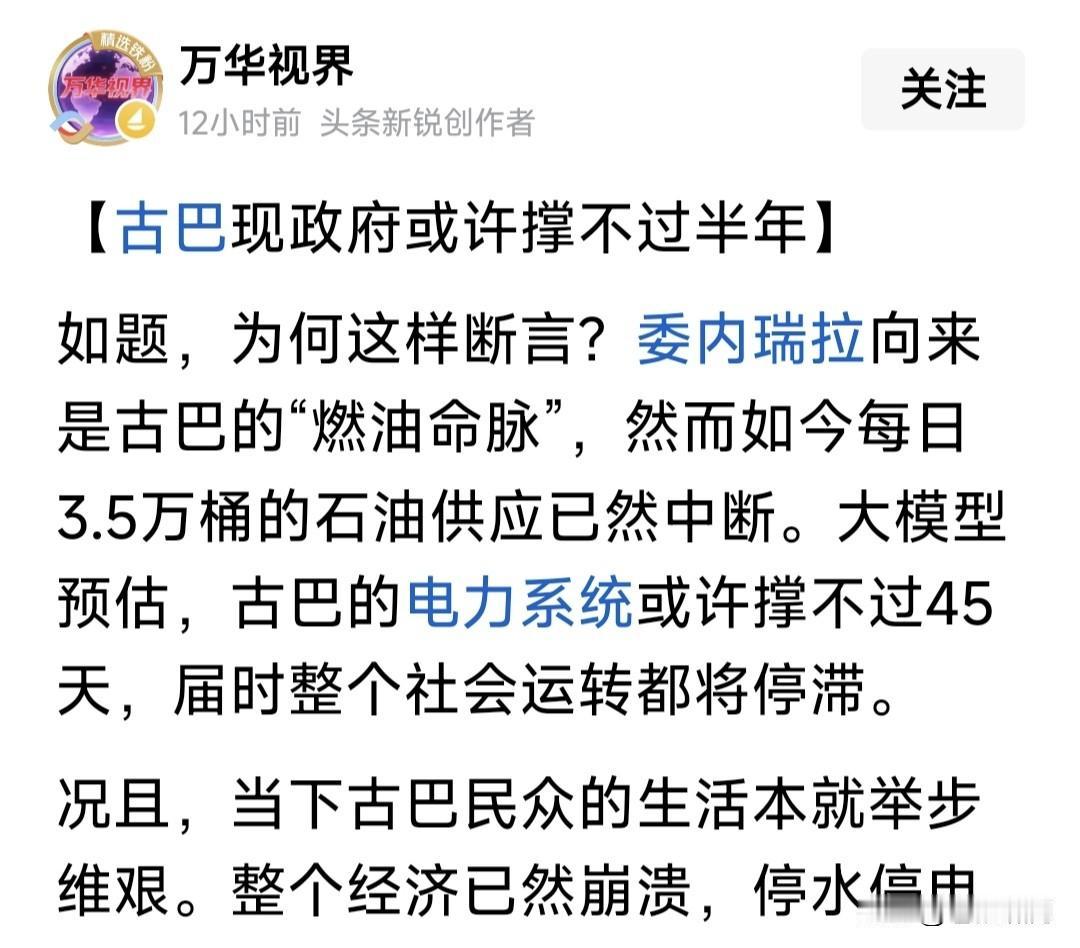 特朗普得寸进尺?刚搞定委内瑞拉,镇住哥伦比亚,又把矛头对准古巴。放言称:不用美国动手,只要断了委内瑞拉的石油,古巴就会完犊子! 这话还真不是胡说!网文资料显示:古巴依赖委石油能源,每天3.5万桶石油是古巴电力命脉,现在供应已经中断,正常情况撑不过一个半月。 届时若电力供给不足,社会就会出现问题!频繁停电停水,经济如何发展?物价急剧升高,民众生活困难,势必发生动荡,古巴政府如何应对? 苍狼有点想不通:古巴建国几十年,为何没搞好国计民生,提升人民生活水平呢?有人说是美帝封锁的原因,但从来没人问:美帝为何要封锁它? 苍狼的观点是:一个国家只要没处于战争状态,和平时期如果不能发展经济,搞不好国计民生,提高人民生活水平,一定是国家方针出了问题! 作为该国政府,不能解决这些问题,只埋怨外部封锁制裁!为何不问一句:美帝为何要封锁?为何不封锁有的国家?为何不从自身找下原因呢? 请看南美这块地方,海洋性气候,资源丰富海运通达,为何抱着老皇历不放?搞不好周边关系,捧着金饭碗要饭吃?还怨天怨地?愧对人民呐! …………