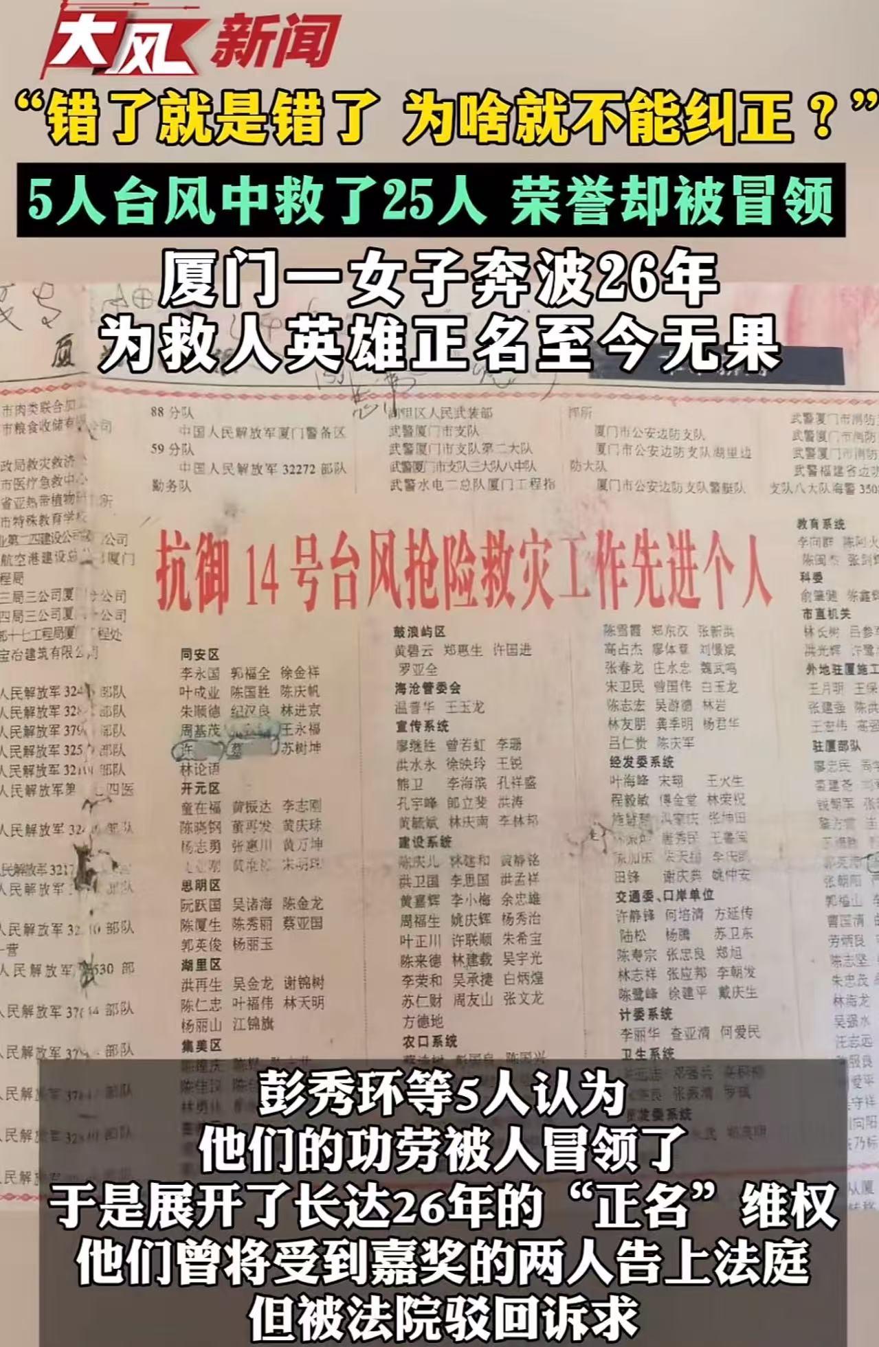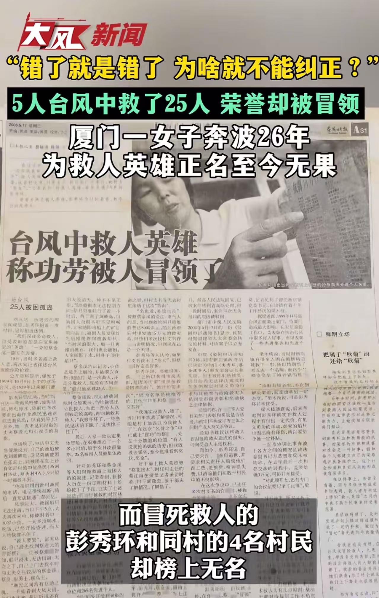 女子台风中冒死救回25人,见义勇为表彰却被村支书冒领,女子为了讨回公道,已经奔波26年,仍然没有结果!。当地官方从最初的回应“当时没有表彰的不再表彰”到近年的“超过申请时效”都让女子无法理解:错了就是错了,为啥就不能纠正? 1999年10月9日,一场被称作“9914号”的超强台风正面袭击厦门。狂风呼啸,巨浪滔天,沿海村庄停水停电,通讯中断。 在厦门市翔安区刘五店浦南里——这个世代靠海吃饭的小渔村,25名渔民被困在离岸不远的孤岛上,生死未卜。 其中,彭秀环的丈夫也在其中。丈夫打电话给彭秀环,说被困者里还有个年仅10岁的孩子,已因一天一夜没吃没喝,几近昏迷;多名成年人也体力透支,随时可能被风浪吞噬。 危急关头,彭秀环四处求援,却屡屡碰壁。有人怕死,有人推脱。 但彭秀环没有放弃,她主动拿出自家唯一一艘木船,还迅速联络了四位平日与丈夫交好的村民——蔡金溪、蔡良、康勇士、蔡乌士。五人一拍即合:“人命关天,豁出去也要去!” 那晚,风力超过12级,海面如沸腾的锅。他们顶着能把人掀翻的狂风,驾着小木船,在漆黑巨浪中颠簸整整一个小时才艰难靠上孤岛。 上岛后,他们给被困者喂水、裹衣,安抚惊恐的孩子。返航时,超载近30%。回程又是一场与死神的拉锯战。 直到次日凌晨,他们才浑身湿透、精疲力竭地靠岸。 25条命,全救回来了,全村沸腾! 可几个月后,当上级政府下发“抗台救灾见义勇为先进个人”表彰名单时,榜上赫然写着村支书徐某的名字,而真正冒死出海的彭秀环等五人,一个都没上榜。 更荒唐的是,村支书事后轻描淡写地说:“这是村干部工作疏忽,不是我冒领。” 可被救的25名渔民联名写证明、按手印,反复向镇里、区里反映,却始终石沉大海。 彭秀环不服,开始奔走维权。这一走,就是26年。 从2000年代初到2026年,她跑遍街道办、区政府、信访局、民政局,得到的回应却越来越冰冷: 最初说:“当时没评上,现在没法补。” 后来说:“表彰申请有两年时效,你早就过了。” 彭秀环气得发抖:“我们的救人行为发生在1999年,福建省那个‘两年申报时效’的规定是2012年才出台的!法律都不溯及既往,你们凭什么用后来的规矩否定过去的事实?” 更让她心寒的是,有人劝她:“算了吧,就算给你发个奖状,也不过是墙上一张纸,能当饭吃?” 她当场回怼:“那岂止是一张纸?那是对25条命的尊重,是对良心的交代!” 如今,当年一同救援的伙伴有的已去世,有的搬离村子,只有她还在坚持。 而官方虽私下承认“当年表彰确实有误”,却始终不愿正式纠正——仿佛只要拖得够久,真相就会自动消失。 此事引发热议,有网友说,错了就不要拿什么时效来搪塞!一要追责是谁批的,二是冒领者的钱要追回是,三是该补发就过去的钱和现在的钱的价值比。 也有网友说,犯了法,是不是久了就过期了?规则的存在是为了维护公平正义,而不是为了掩盖错误。 还有网友说,正义岂能稀里糊涂!没有她这种执拗的性格,她也不会去救人。 这事最令人窒息的,不是村支书冒领荣誉,而是体制用“程序”二字,把正义拖成了笑话。 一个女人,冒着生命危险在台风夜救回25人,本该被铭记、被传颂。 结果呢?功劳被截胡,申诉被搪塞,26年青春耗在“等一个说法”上,换来的却是“过了时效”“无法追溯”的官腔。 规则本该是守护公平的盾牌,如今却成了掩盖错误的遮羞布。 当“程序正确”凌驾于“事实正义”之上,当“不溯及既往”只用来拒绝纠错、却不用来保护善行,那这套制度,就已经病了。 更讽刺的是,我们总在灾难后高喊“致敬英雄”,可真正的英雄站在面前时,却连一张迟来的奖状都吝于归还。 彭秀环要的从来不是名利,而是一个信号:在这个社会,做好事不会被遗忘,更不该被窃取。 如果连25条人命换不来一次正名,那下次台风再来,谁还敢驾船出海?谁还信“善有善报”? 别让英雄流血又流泪,更别让26年的坚持,最终输给一句轻飘飘的“超时效”。