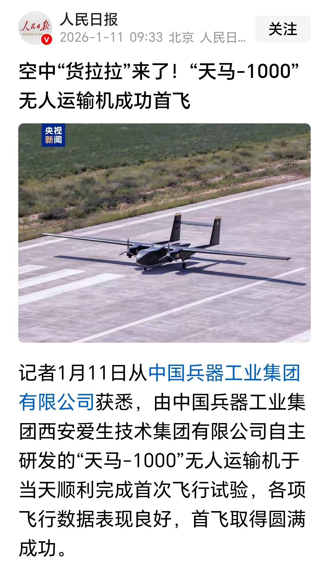 天马-1000无人运输机来了。滑跑距离小于200米,作战距离,哦,不对,是飞行1800公里。 这么短的滑跑距离,岂不是可以上航母,可以上小平板?[奸笑] 央视都说了是空中货拉拉,民用的,别乱想。[偷笑] 可以送个救灾物资啥的,可以给偏远地区投送点补给什么的,比如南海岛礁[笑哭],方便得很。 你们这些人不要想挂什么炸弹之类的哈,送货的,这是送货的,这是送货的。[我想静静] 你可以忽略它的生产厂家,比如我就没有看到它是中国兵工集团出品的。 顺便说一句,它为什么一出来就叫天马1000啊,难不成就是因为载弹量,哦,不,是载重量1000公斤?会不会后面有天马-9000呢?期待! 点右上角关注我,我们一起去看这个魔幻的世界