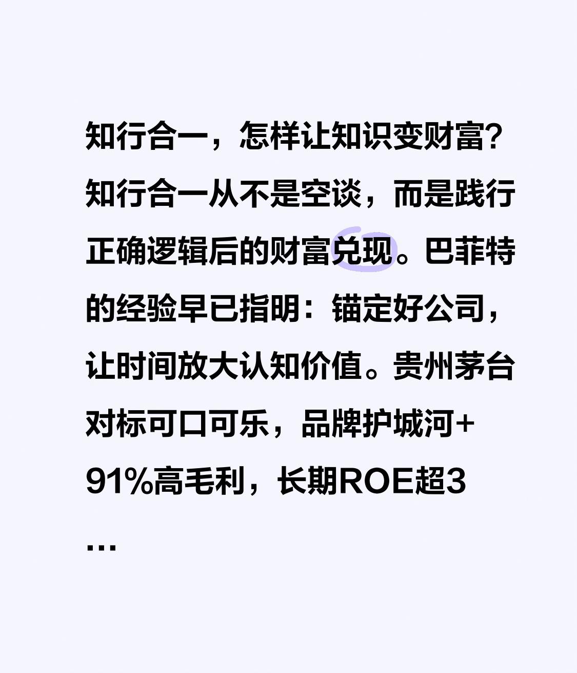 知行合一,怎样让知识变财富? 知行合一从不是空谈,而是践行正确逻辑后的财富兑现。巴菲特的经验早已指明:锚定好公司,让时间放大认知价值。 贵州茅台对标可口可乐,品牌护城河+91%高毛利,长期ROE超30%,数十年复利印证“持有伟大企业”的逻辑;招商银行堪比美国运通,零售壁垒筑牢现金流,稳定分红让长期持有更具底气。长江电力手握水电垄断资源,现金流永续且抗周期,是“看懂后坚守”的典范。 把价值投资知识转化为“选对标的+长期持有”的行动,财富自由不过是时间的必然答案。