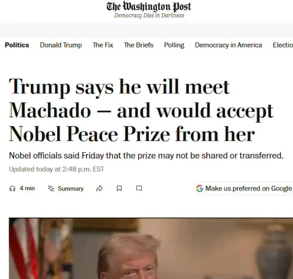 特朗普想“接手”诺贝尔和平奖,这事靠谱吗? 他对身边人说,如果今年得主马查多下周见面时“愿意把奖给我”,那他就乐意收下,还顺带炫耀自己“结束了八场冲突”。 但挪威诺贝尔委员会马上公开澄清:奖项一经宣布,“不能撤销、不能共享、也不能转让”,并强调这个规则“永远有效”,等于当面关上了这扇门。 他随后又把火力对准挪威,说自己拿不到奖是挪威的“耻辱”,却又承认其实并不清楚挪威在评选中有多大话语权,这种前后矛盾的说法,在美国媒体和社交平台上被放大嘲讽。 不少评论用“可悲”“太丢脸”形容他想要别人奖牌的做派,把严肃奖项说成像礼物互送,引发一片群嘲。 真正应该讨论的,或许不是他能不能拿奖,而是:和平奖到底该看谁的实际成果?你觉得政客公开“讨奖”,会不会反而让这个奖在公众眼里打折?