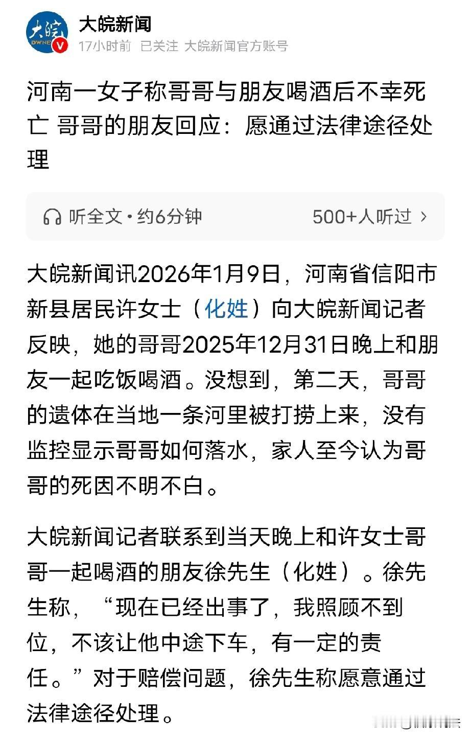 “又是喝酒惹的祸!”河南信阳,女子的哥哥和朋友一起喝酒,之后去澡堂途中下了朋友的车,次日,遗体在河里被发现,女子说:哥哥头上有伤口流血,死因不明不白,怀疑在车内发生争执?朋友赔偿10万,后续还有20万分期付款待支付,但女子觉得赔偿的太少了,朋友无奈表示:是她哥哥抢方向盘,才让他下了车,后来他追车,我没听到他喊我…如果嫌少,就让法院判吧! 据大皖新闻1月10日报道,许女士(化姓)的哥哥去朋友家喝酒,可第二天,她接到电话,说她哥哥的遗体从一条河里打捞上来…… 事件经过是这样的,2025年12月31日晚上,许女士的哥哥被朋友徐先生(化姓)叫到家里吃饭喝酒,当天,徐先生的父亲也在场,快结束后另一位朋友也来了。 饭后,一行人开车准备去澡堂洗澡放松一下,不料,途中,许女士的哥哥突然要求下车。 监控显示,哥哥下车后,在车后面追车,但是,车没有停,直接开走了。 当时,哥哥下车的位置离家大概有4、5公里远,他进了一个小区后,又出来,就不见了踪影。 据许女士讲,次日下午4点多,她接到警方电话,得知哥哥出事了,他从河里被打捞上来。 许女士和父母心急如焚,从外地赶回老家。 警方称哥哥是意外死亡,落水后没有挣扎的痕迹。 不过,许女士却有她的想法,她发现哥哥头上有伤口还流了血。 同时她提出质疑,哥哥下车前10分钟,有一段路是500米,可从监控里看车开了10分钟,如果正常车速也就一两分钟而已。 哥哥出事后,许女士一家人为了让他入土为安,就和哥哥的朋友签了一份协议,对赔偿金额进行了约定。 事后,朋友徐先生赔偿了10万,后续还有20万需要分期付款还待支付。 但是,许女士改了主意,觉得赔偿金额太少了。 徐先生对于这件事也有话说,他回忆事发当天晚上,许女士的哥哥确实来到家里,与他们一起吃饭喝酒。 因为,徐先生之前和许女士哥哥聊天来着,想着哥哥一个人在跨年夜挺孤独的,就叫他来家里吃饭。 而且,当时自己父亲也在,快吃完饭时,又一个朋友也来了。 后来,吃完饭,大家决定一起去澡堂。 可途中,许女士的哥哥自己要下车。 徐先生讲,当时他不让哥哥下车,因为外面下雪了,可是,哥哥一手搂着他,一手抢方向盘。 所以,徐先生让哥哥下了车,但是,徐先生开出去100米后又回来找哥哥,担心下雪天他一个人有危险,可是没有找到人。 对于许女士的质疑,哥哥下车后,有追车的动作,车为什么直接开走了? 徐先生解释说,自己的车密封性很好,没有听到哥哥的呼喊。 据徐先生说,这事是他报的警,因为他第二天回家看到许女士哥哥的手机落在他家了。 徐先生考虑到哥哥没手机不方便,就找到哥哥的家里,但家里没人。 找不到人,徐先生也有担忧,就选择了报警。 悲剧发生后,徐先生在警方的见证下,和许女士一家签了赔偿协议,约定赔偿30万。 徐先生还说,他和许女士哥哥都是本家,关系一直挺好的,出事了,也是自己照顾不到位,他也后悔不该让哥哥中途下车。 徐先生说:“没有把他安全送到家,我有一定责任。” 不过,对于许女士觉得赔偿金额少,徐先生也说了,如果她不认可协议就作废,后续可以让法院判决,该赔偿多少就赔多少。 这件事确实让人匪夷所思,许女士认为哥哥的死因有疑点。 但朋友徐先生也给出了他的解释。 有人说,哥哥为什么要自己中途下车,为什么路途抢夺方向盘非要下车?这必须要搞清楚。 况且离家还有四五公里,那么远的路程怎么会让他一个人下车回家?即使他夺方向盘可以停下来?报警都可以的。 如果送到家,至少尽了责任,送到半道,后面出了事,这就不好下结论了。 从法律方面来说,朋友徐先生是存在一定过错的。 《民法典》第1165条规定:行为人因过错侵害他人民事权益造成损害的,应当承担侵权责任。 此事中,徐先生组织饭局让许女士哥哥喝酒,喝酒后,哥哥处于不太清醒的状态。 按常理,组织者得保证参与者安全,应该将他安全送到家,通知家属,可徐先生没做到,让哥哥中途下车,最后哥哥意外死亡。 这就好比你是活动负责人,没照顾好参与者让他受伤了,肯定得负责。 徐先生有一定过错,他没尽到安全护送义务,得承担侵权责任,要赔偿相应损失。 另外,许女士认为30万赔偿太少了,她可以解除协议,重新要求徐先生赔偿吗? 许女士一家当时急着让哥哥入土为安,可能没仔细考虑赔偿金额合不合理就签了协议。 要是他们当时对赔偿金额有重大误解,比如以为 30 万就是合理赔偿,后来发现远远不够,或者徐先生利用他们处于悲痛、着急的状态,让他们签了对自己很不公平的协议。 这种情况下,许女士一家就可以请求法院或者仲裁机构撤销这个协议,重新商量赔偿的事。 有人说,请客东家这个态度挺好的,人家没有推卸责任,第一时间签了赔偿协议,30万其实不少了,你咋看呢?