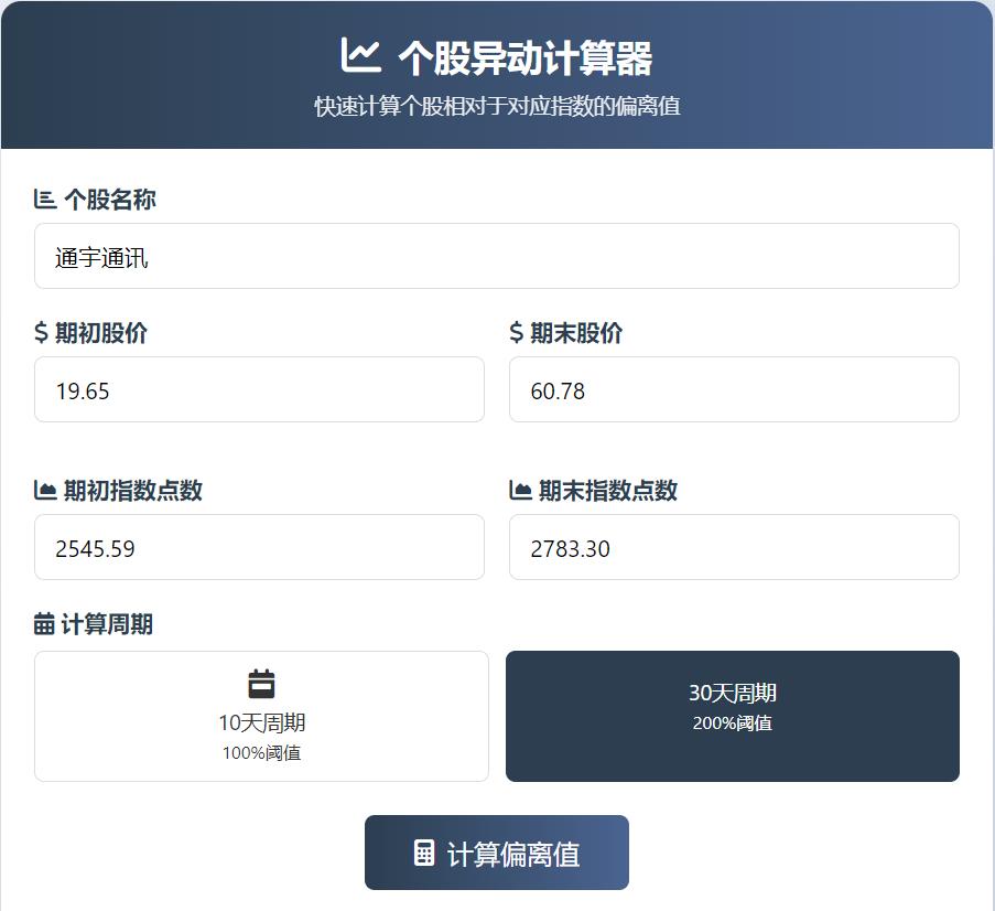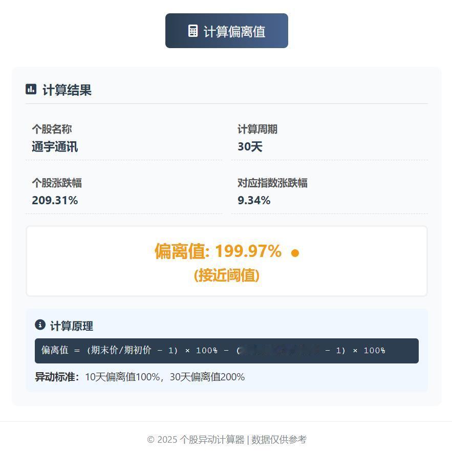 中午又了学习了一下异动规则,自己写了一个简单的html小页面简单验证了一下[笑哭][笑哭][笑哭] 计算了下通宇通讯的30日异动偏离值为199.97%,和炒股app上提供的数据一致,说明计算方法没有问题。[呲牙] 随后又计算了通宇通讯新的29日的异动偏离值为171.67%。