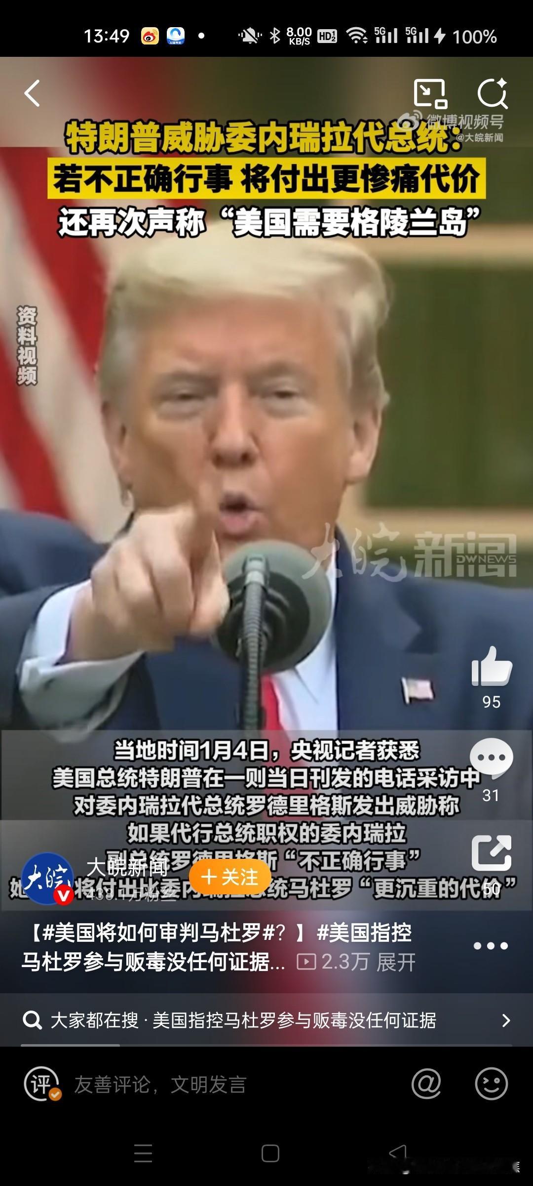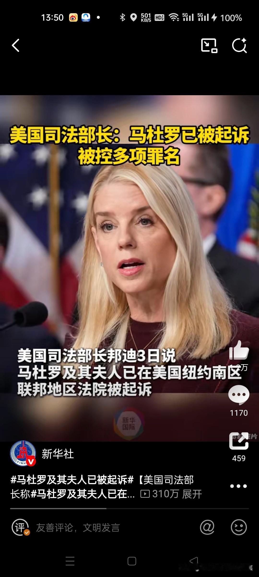审判马杜罗证明美国的司法独立,假的!从特朗普抓马杜罗,到马杜罗被审判,我感觉美国的法院也被特朗普控制,法院在配合马杜罗演戏?说好的司法独立呢?司法的程序呢?拘留?逮捕?什么时间侦查?什么时间起诉?什么时间开庭?一切都是乱套,没有管辖权,人还没有抓,就已经起诉了? 一切都是混乱的,一切都是特朗普的强权! 马杜罗被美军抓捕后已在纽约联邦法院首次出庭,面临四项刑事指控,引发国际社会对美国单边行动的强烈谴责。 一、审判核心进展:罪名与程序 指控内容 美国司法部以25页起诉书指控马杜罗及其夫人等6人犯有: 毒品恐怖主义阴谋罪 可卡因走私阴谋罪 持有机枪及破坏性装置罪 针对美国的持有机枪及破坏性装置阴谋罪。 检方称其“将委内瑞拉变成毒品转运中心”,并利用资金维持政治权力。@大皖新闻36 首次出庭细节 马杜罗夫妇于美国东部时间1月5日中午在纽约曼哈顿联邦法院出庭: 马杜罗全程表现强硬,用英语向旁听席问候“新年快乐”,并记录笔记要求保留;@中国新闻网 案件由92岁法官阿尔文·海勒斯坦审理,此前他曾驳回特朗普的移民政策。114 后续司法程序 马杜罗被关押在纽约布鲁克林大都会拘留中心(MDC),该设施以暴力频发、条件恶劣著称;@北京日报 “毒品恐怖主义罪”单项最高可判终身监禁,参考1990年诺列加案(判刑40年)。@看看新闻Kn...9每日经济新闻今视频长天新闻大皖新闻看看新闻Knews 二、争议焦点:合法性与国际法冲突 美方辩解理由 特朗普政府声称: 不承认马杜罗2024年连任合法性,视其为“非法领导人”;1 行动系“司法部追捕逃犯”,由军方配合执行。@环球网47 国际社会谴责 程序违法:多国指出美国跨境抓捕主权国家元首违反《联合国宪章》主权平等原则,侵犯元首豁免权;@直新闻311 证据缺失:中国学者孙岩峰指出,美国无实质证据证明马杜罗涉毒,缉毒署报告亦未将委列为主要毒源地;13 双重标准:特朗普赦免涉毒洪都拉斯前总统,却武力抓捕马杜罗,被批政治操弄。@今视频长天新...1新华社大皖新闻 三、地缘政治影响与后续走向 委内瑞拉政局动荡 副总统罗德里格斯代行职权,宣布马杜罗为唯一合法总统,全国进入紧急状态;@大河报19 军方高层否认涉毒指控,斥“太阳集团”为美方虚构叙事。1 美国战略意图 分析认为此举系“新门罗主义”实践,旨在控制委石油资源及战略位置;41116 特朗普暗示将“管理委内瑞拉至安全过渡”,可能扶植亲美反对派。1516 国际博弈升级 联合国安理会紧急会议谴责美国侵略,中俄法等国发声反对单边霸凌;@每日经济新闻411 拉美多国(古巴、哥伦比亚)称地区面临“残酷攻击”,呼吁集体回应。11 四、关键人物动态 马杜罗辩护团队:阿桑奇案律师介入,计划以“非法抓捕违反程序”为核心辩护策略;912 特朗普政府角色:国务卿鲁比奥主导行动舆论,称“无需进一步军事打击”。@新华社23