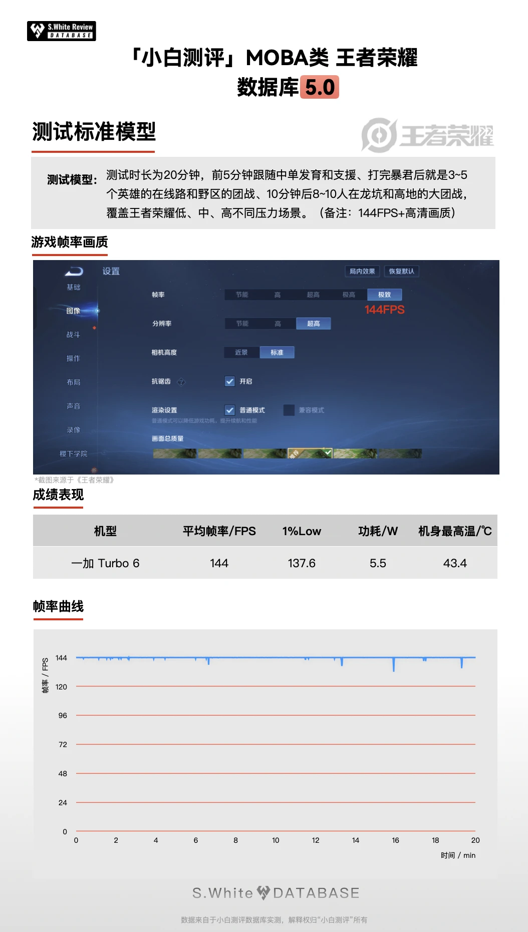 1、20分钟《王者荣耀》:平均帧率144FPS(满帧144),1%Low帧137.6,功耗5.5W,机身最高温43.4℃;
