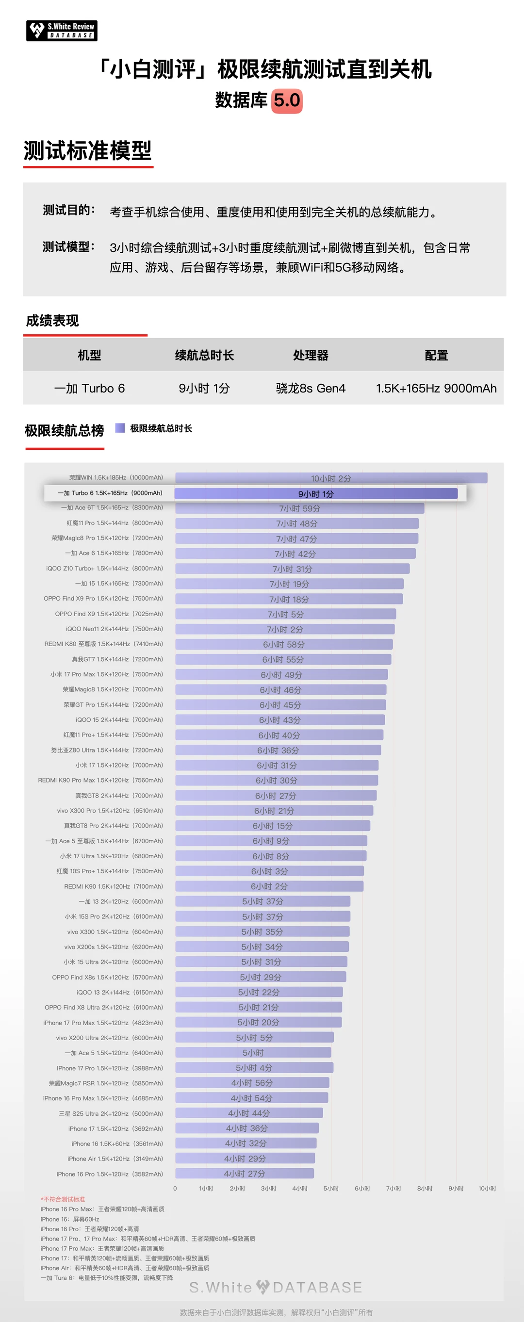 小白测评数据库5.0-多场景续航模型下实测,一加Turbo 6三小时综合续航测试剩余77%,六小时重度续航测试剩余25%,极限续航测试直到关机,共坚持了9小时1分钟。