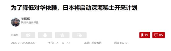 日本拿压箱底技术破稀土牌?2026年1月9日,日媒:日本将启动深海稀土开采计划!为防止日本政府狗急跳墙,我军再开军演! 毫不夸张的说,日本重稀土方面高度依赖我国进口。就在最近这段时间,中日关系急转恶化。针对日本首相发表的错误涉台言论,我国在通过外交手段发布多则警告后,直接采取了反制措施。 2026年的开年,我国就军民两用物对日本进行了出口管控。我国在宣布这则消息后,日本国内对此极度的恐慌。所以面对中国的反制,日方开始采取了其他实际行动,以此来降低对中国的稀土依赖。 根据日本媒体2026年1月9日的报道,日本政府将会在2026年1月11日的时候,开展罕见的深海稀土试采计划,以此降低对华依赖。 日本想要在深海开采稀土非常的困难,其加工成本就要远比我国高。所以想要达到商业化规模,至少需要多年的时间。 在这几年的时间里,给我国稀土出口带来的影响非常有限。可是如果日本真的掌握了稀土技术,从长远来看对我国一定会造成影响。 日本的这一行为足以证明,我国对日本的稀土制裁起到了明显的效果。而为了防止日本政府会因为我国的大力管控狗急跳墙,就在2026年1月10日的时候。我国重磅宣布在2026年1月10日至1月30日期间,我国将会在渤海部分海域执行军事任务,禁止驶入。 上有政策,下有对策!稀土资源对我国来说确实是一张底牌,但我国也不仅有这一张底牌。对此,您怎么看?欢迎评论区留言您的看法。 (信息来源:为了降低对华依赖,日本将启动深海稀土开采计划-观察者网) (信息来源:航行警告!渤海部分海域执行军事任务,禁止驶入-北京日报客户端)