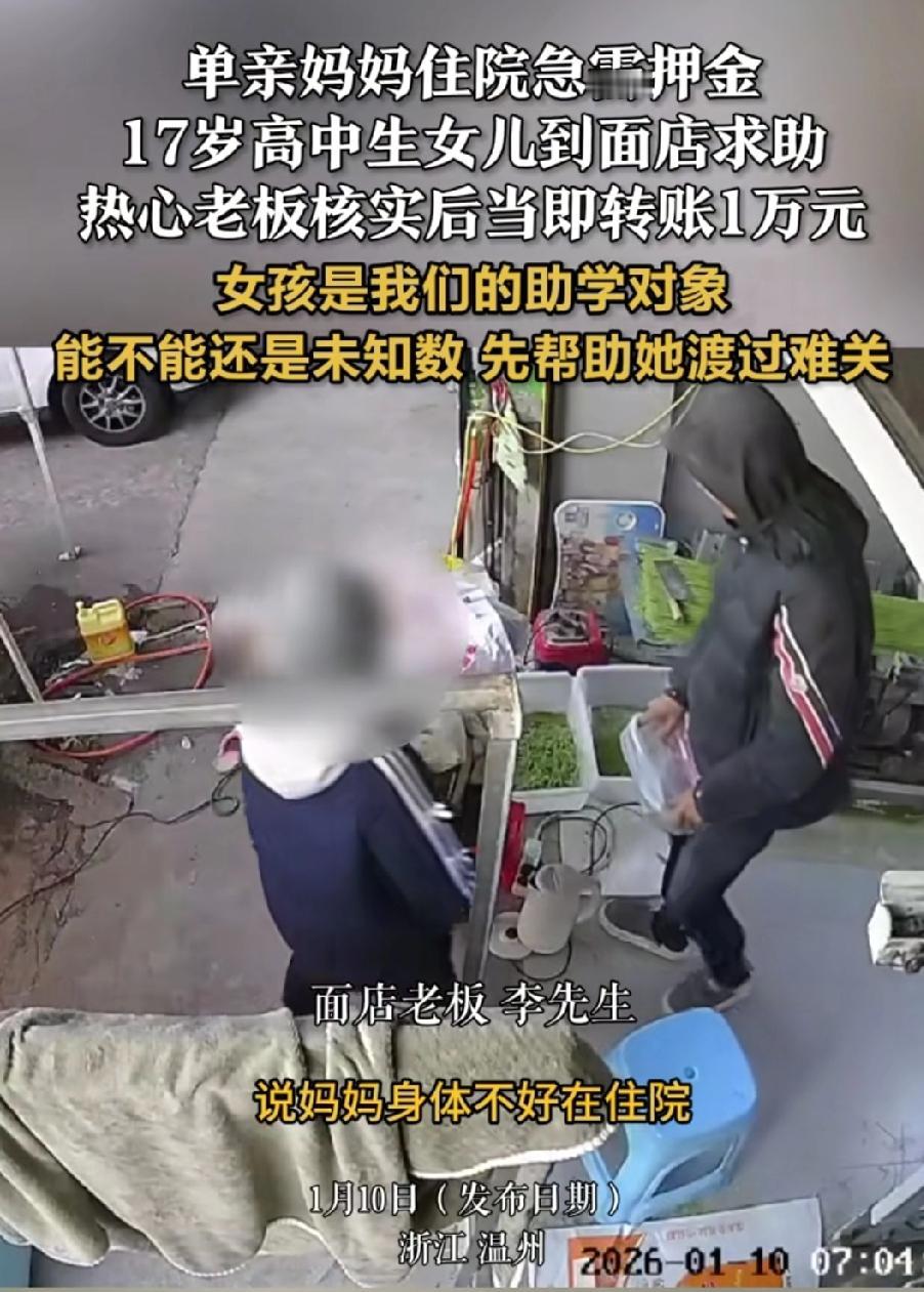 泪目!浙江温州,一位单亲妈妈突发疾病住院急需押金,17岁女儿向常去的面店老板求助。老板明知这钱可能还不上,却毫不犹豫转了1万,还送了热面。这事传开后,网友们纷纷怒赞:“这老板活该发财!” 这天早上,面店刚开门不久,17岁的女孩就红着眼眶走进来。她跟老板说:“我妈妈生病住院了,要交一万块押金,可我没钱,您能借我吗?” 老板和这家人相熟,知道女孩品学兼优,知道她们母女相依为命,生活全靠妈妈打零工和学校资助。这笔借款,不是一时冲动的施舍,而是基于了解和信任的托付。 老板没有只听女孩的一面之词,而是当即给病床上的妈妈打去了视频。这个举动,既是对危急情况的核实,更是对母女俩尊严的呵护——他让妈妈亲口确认,而不是把求助的女孩反复推到窘迫的境地。 开过店的人都知道,一碗面利润很薄,一万元可能要卖上千碗才能赚到。老板难道不懂吗?他太懂了。 但在他的心里,算的不是经济账,而是良心账:一边是可能损失的钱,一边是确定能救回的命和孩子的未来。他义无反顾地选择了后者。 有网友说“他赌上了钱,却给女孩照亮了整个未来!” 这借出的不止是钱,更是一份毫无保留的信任。这束光,会让这个女孩相信,世界虽有风雨,但总有善良可以依靠 妈妈那句‘一定慢慢还’,就是最好的教养。” 病床上虚弱的承诺,和老板不计回报的付出,构成了一场最美的“双向奔赴”。它让我们看到,仁义与诚信,依然是这个社会最珍贵的品质。 面馆老板的义举,点燃我们每个人内心对善良的渴望和信心。在这个时代,最珍贵的不是精明算计,而是那点看似“傻气”的义气;最硬的“通货”,不是金钱,而是人与人之间那份干净纯粹的信任。 这一万元,早已超越了它本身的面值。它是绝望时的援手,是冰天雪地里的暖炉。它证明了,最高贵的善良,往往就藏在“明知艰难,仍要为之”的平凡选择里。