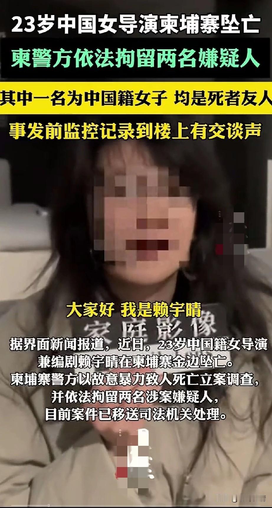23岁中国女导演在柬埔寨坠亡, 她的两名合作伙伴被抓, 一位是被她夸过的印度人, 另一名是中国籍的女制片人, 事发时间是2025年12月30号凌晨, 监控拍到了女子站在房外, 随后上了楼, 是一个法国男子将他带上了楼, 随后楼梯间产生了交谈的声音, 没有多久女导演便从2楼坠亡, 印度人和中国籍女制片随后下楼查看, 然后将她送往医院, 由于抢救不过来, 在1月2日宣布她死亡! 女导演名叫赖宇晴, 祖籍福建,出生于天津, 曾在纽约、洛杉矶和多伦多留学, 之前曾拍摄过电影《潮汐低语》, 这次在柬埔寨金边是去拍电影, 她自己也没有想到会在柬埔寨出事, 大家都知道柬埔寨的金边是非常危险的地方,但是为了她的电影, 她还是义无反顾的前往了, 这名印度人是她的朋友, 中国籍的女子是她长期伙伴, 可以说三个人关系比较好, 没有想到会在这次拍电影过程中, 被人用钝器击打头部, 当地警方发现女导演并非坠亡这么简单,因此立刻拘捕了她的两名朋友, 并且对女导演进行了尸检, 发现是被击打头部袭击, 并且现场还提取到了指纹, 有网友猜测女导演是被法国人性侵后,不堪受辱跳楼逃生致死, 可以说这个猜想基本不成立, 因为她的朋友和那边印度人都住在1楼! 也有网友猜测是她的女性朋友和印度人勾结,将她谋害了,三个人可能是三角恋!如今案件还没有被调查清楚, 不过印度人和他的女性朋友都被逮捕了,相信女导演的死和两个人脱不了关系!大家觉得女导演为什么会从二楼坠亡? 柬埔寨金边 赖宇晴 柬埔寨悲剧 柬埔寨失联女子