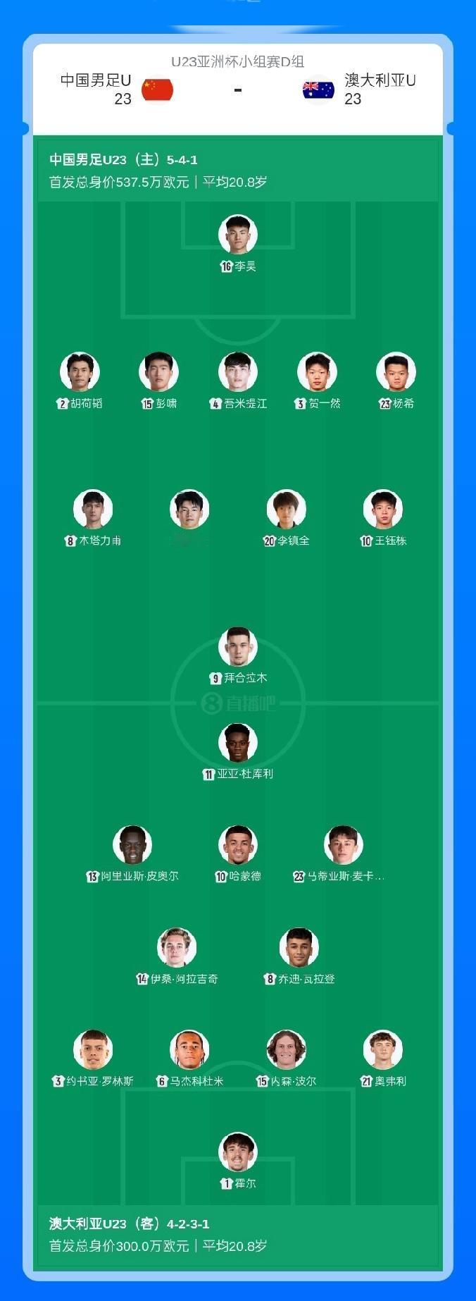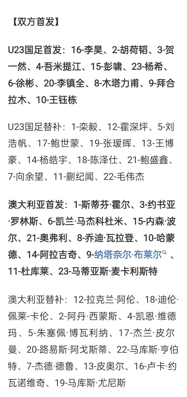 U23国足vs澳大利亚首发:王钰栋、拜合拉木领衔,杨希、胡荷韬、李镇全、徐彬先发 01月11日 北京时间19:30,U23亚洲杯小组赛D组第2轮,U23国足对阵U23澳大利亚。赛前,双方首发出炉:国足方面,王钰栋、拜合拉木领衔,杨希、胡荷韬、李镇全、徐彬先发,向余望、蒯纪闻、-刘浩帆、鲍世蒙替补待命