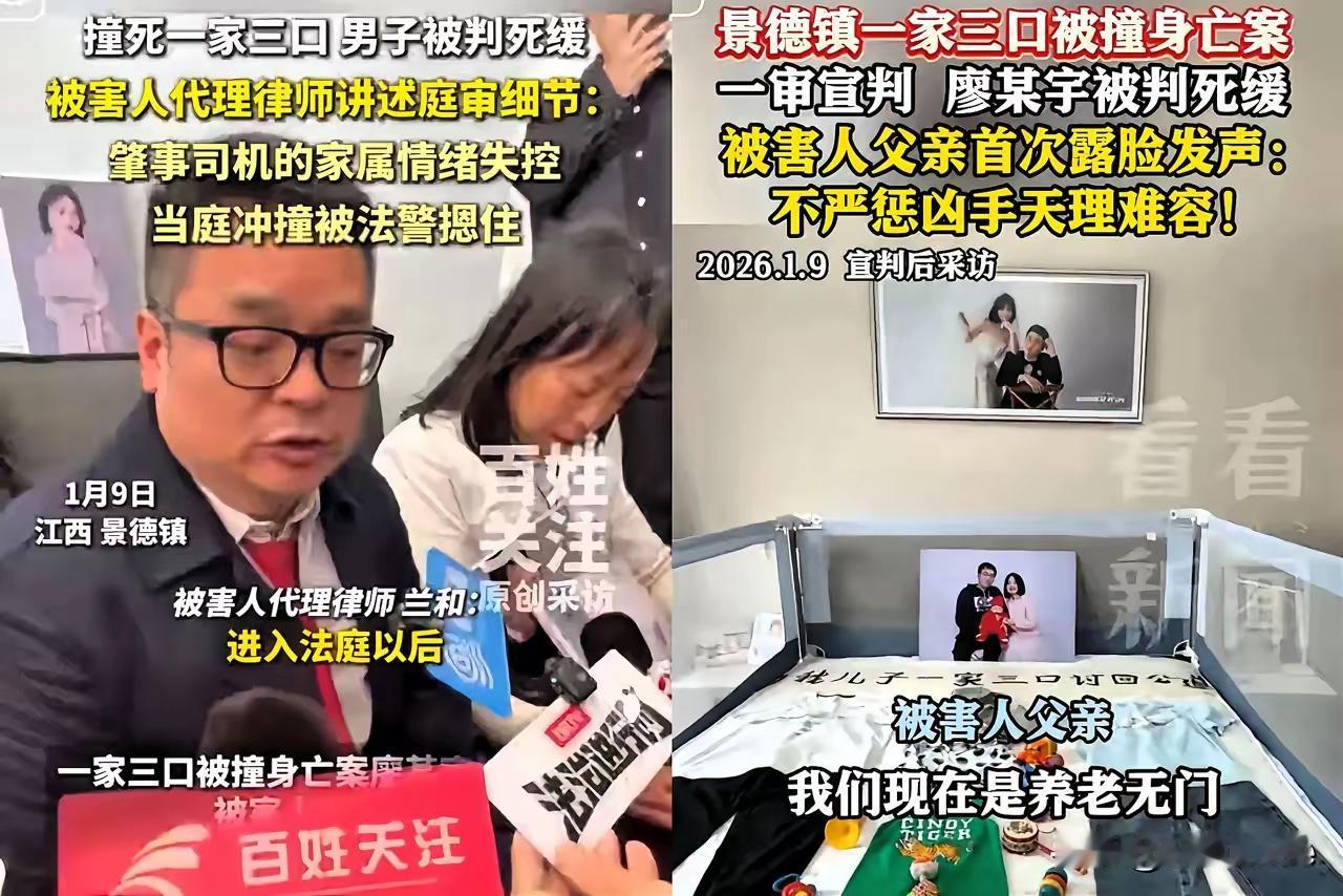 景德镇灭门案,廖某宇的父亲如今估计悔不当初。他后悔的并非儿子撞死三人,而是自己在法庭上冲动一冲,亲手断了儿子的生路 2024年10月2日傍晚,景德镇昌江大道的晚高峰还没散去。18时42分,一声剧烈的撞击声划破街区的喧嚣,一辆白色电动汽车以129公里的时速,撞上了正在过马路的一家三口——31岁的胡某、30岁的王某某,还有他们怀里不满1岁的婴儿。限速40公里的城市主干道上,这辆车在14秒内两次将电门踩至100%,完全无视同车女友的劝阻,也不顾节假日人流密集的路况。 婴儿当场殒命,年轻父母经抢救无效相继离世。目击者说,撞人后肇事司机廖某宇没有丝毫慌乱,反而淡定点燃香烟,和同行人员谈笑风生,甚至传出“撞死了也活该”的冷血言论。这个刚满20岁的年轻人,此前就曾向朋友炫耀过车辆的加速性能,却没想过这份“性能”会成为剥夺三条生命的凶器。案发后他虽拨打了120和110,留在现场等待处理,构成法律意义上的自首,但这份“主动”更像无法逃脱后的无奈选择,全程未见半分悔意。 受害者胡家老两口,一夜之间失去了独子、儿媳和孙辈。四百多个日夜,他们守在儿子的婚房里,墙上的全家福还留着一家三口的笑容,可屋里的温度早已随着亲人的离去变得冰冷。两位老人患上了严重的抑郁和创伤后应激障碍,走路要扶着墙,睡觉要开着灯,稍有响动就浑身发抖。他们的诉求很简单,只求凶手得到应有的严惩,可廖家的态度,却一次次往他们的伤口上撒盐。 廖某宇的父亲从一开始就摆错了姿态。他没有半句道歉,反而放出狂言:“我儿子撞你全家是天灾,你们追着不放就是人祸”。更令人发指的是,他还对受害者家属发出死亡威胁,扬言“再追究就让你们全家彻底消失”,甚至想用迷信手段威胁对方息事宁人。案发后协商阶段,廖家虽提出80万赔偿,却带着施舍般的傲慢,完全无视受害者家属的情感创伤,谈判自然不欢而散。 真正让事情走向无法挽回的,是庭审现场的闹剧。当审判长宣读完判决书核心内容,法庭程序尚未结束时,廖父突然从旁听席冲出,朝着被害方代理律师的方向扑去,扬言要动手打人。法警及时上前按住了他,可这份嚣张与冲动,彻底浇灭了所有和解的可能。原本法院审理时已考虑到廖某宇有紧急制动、打方向盘的避让动作,主观系间接故意而非直接追求死亡,加之自首情节,量刑时本有从宽空间。 但刑事案件中,加害方的悔罪态度和被害人谅解,往往是影响量刑的关键酌定情节。廖父的威胁与法庭闹剧,不仅没为儿子争取同情,反而让受害者家属彻底寒心,坚决拒绝出具谅解书。被害方代理律师明确表示,廖家的行为彰显了对生命的漠视,这种态度让和解失去了任何基础。法院最终以以危险方法危害公共安全罪,判处廖某宇死刑缓期二年执行,剥夺政治权利终身,而被害人家属仍坚持申请抗诉,誓要维权到底。 廖父大概到最后都没明白,法律的从宽是给有悔罪之心的人,不是给嚣张跋扈的人。我国刑法明确规定,自首可以从宽,但需结合悔罪表现综合考量。廖某宇全程冷漠,不道歉、不赔偿,其父亲又以威胁、暴力方式激化矛盾,这种情况下,即便有法定从宽情节,也难以获得大幅度轻判。如果廖父当初能放下姿态,真心道歉、积极赔偿,争取受害者家属的谅解,或许判决结果会有所不同。 这场悲剧里,廖某宇的罪行是根源,他把情绪失控的代价转嫁给无辜家庭,用极端危险的行为践踏公共安全。而廖父的冲动,则成了压垮儿子的最后一根稻草。他在乎的只是儿子的刑期,却忘了三条逝去的生命背后,是一个破碎的家庭和两位老人余生的痛苦。法律的判决既坚守了“少杀慎杀”的司法理念,也彰显了“罪责刑相适应”的原则,不会因为凶手的家庭态度而偏离正义的轨道。 生命没有高低贵贱,公共安全不容漠视。廖父的“悔”,从来不是对受害者的愧疚,只是对儿子刑期的不甘,这种自私的悔恨,终究换不回三条逝去的生命,也赎不清父子俩欠下的罪孽。尊重法律、敬畏生命,才是每个人行走世间的底线,一旦突破,再后悔也无法挽回。 各位读者你们怎么看?欢迎在评论区讨论。