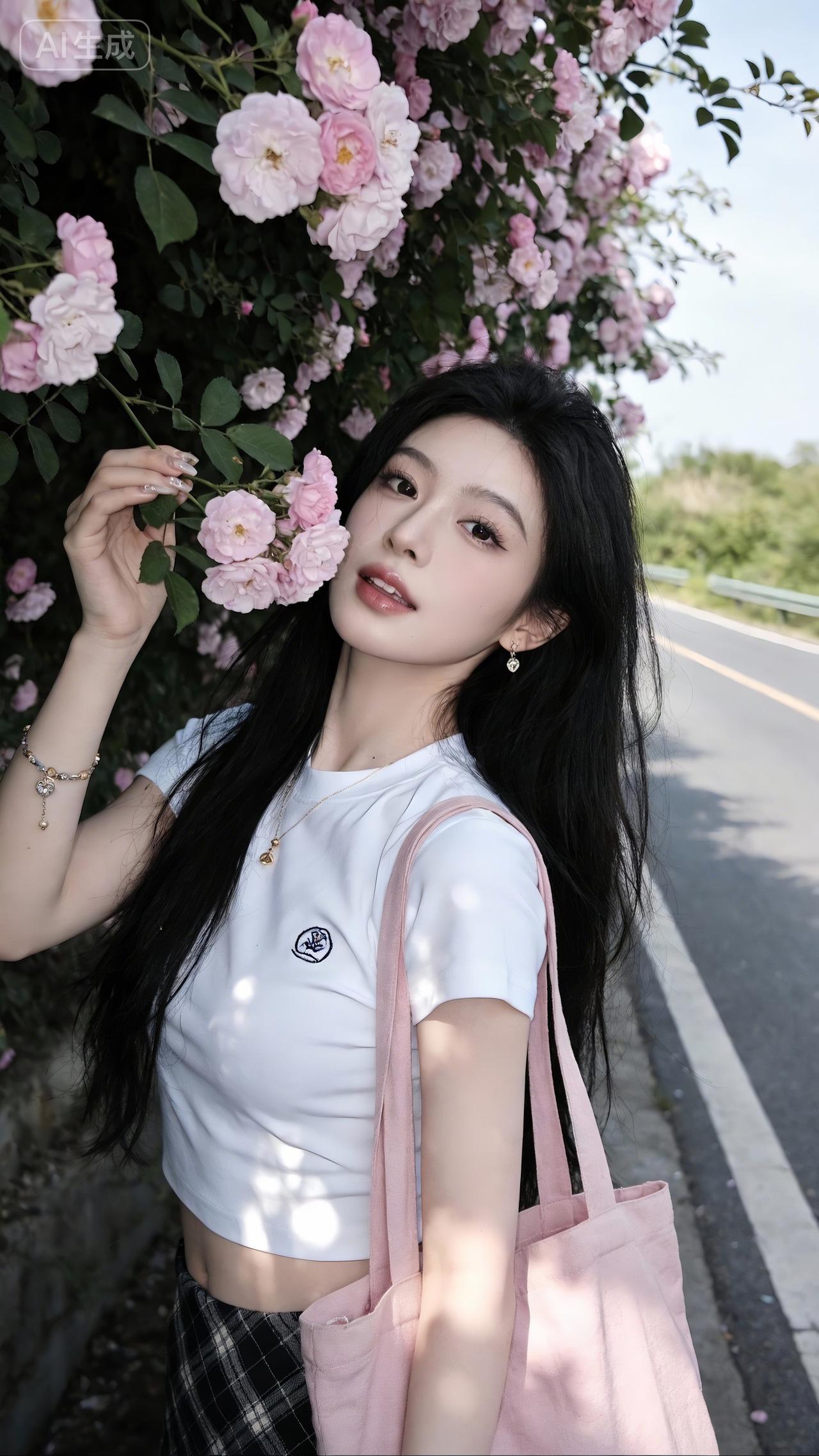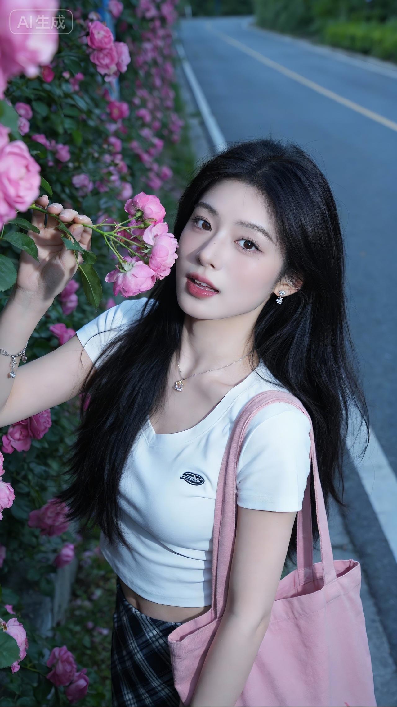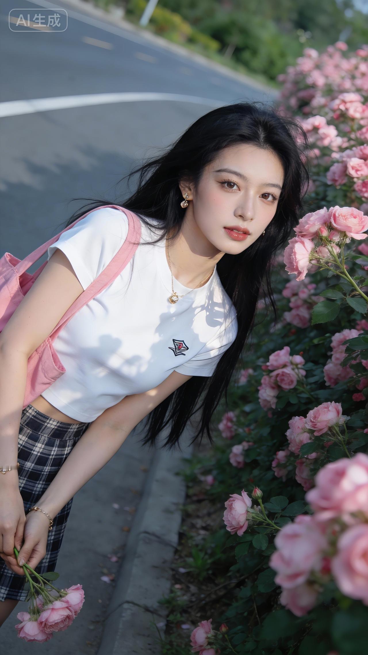 花径旁的清甜系少女 白T+格裙衬得清爽又灵动,粉包和腕间碎光添了点甜~轻嗅玫瑰的瞬间,连风里都裹着春日的软香✨ 是把“青春氛围感”焊在身上的妹妹!玫粉色衬衣裙