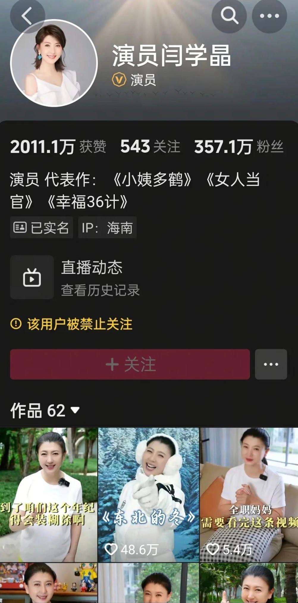 闫学晶账号被禁止关注在直播里说农民一年挣二十万轻轻松松,自己儿子一年挣几十万太少了,两个直播平台的号都被禁止关注了