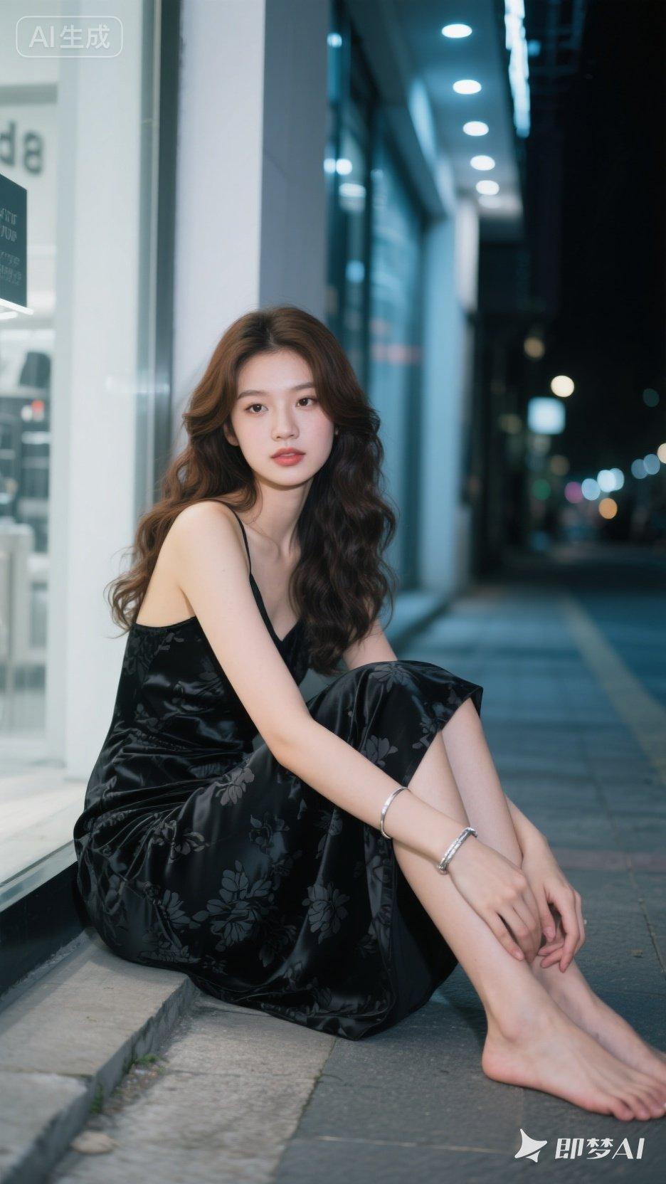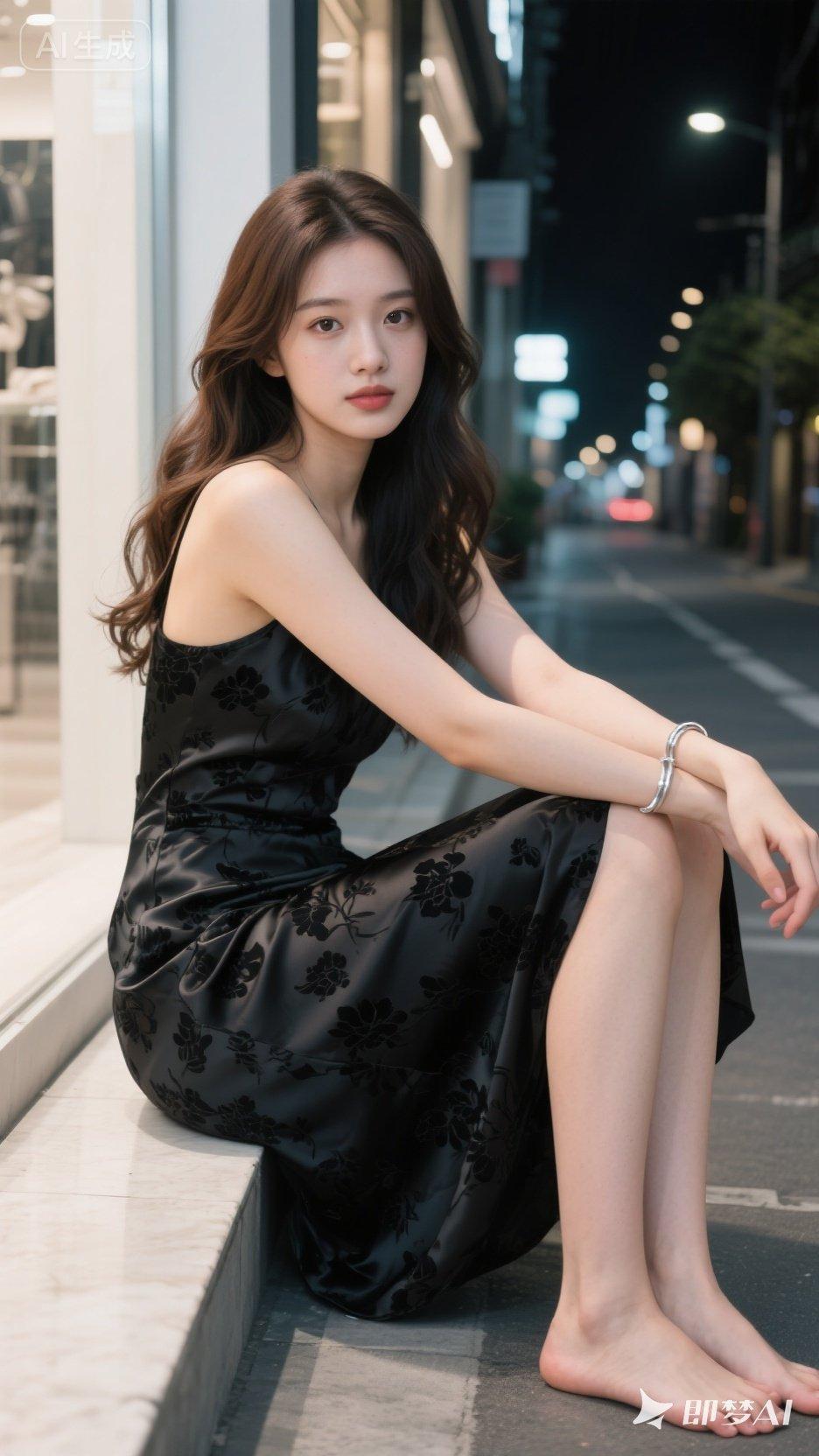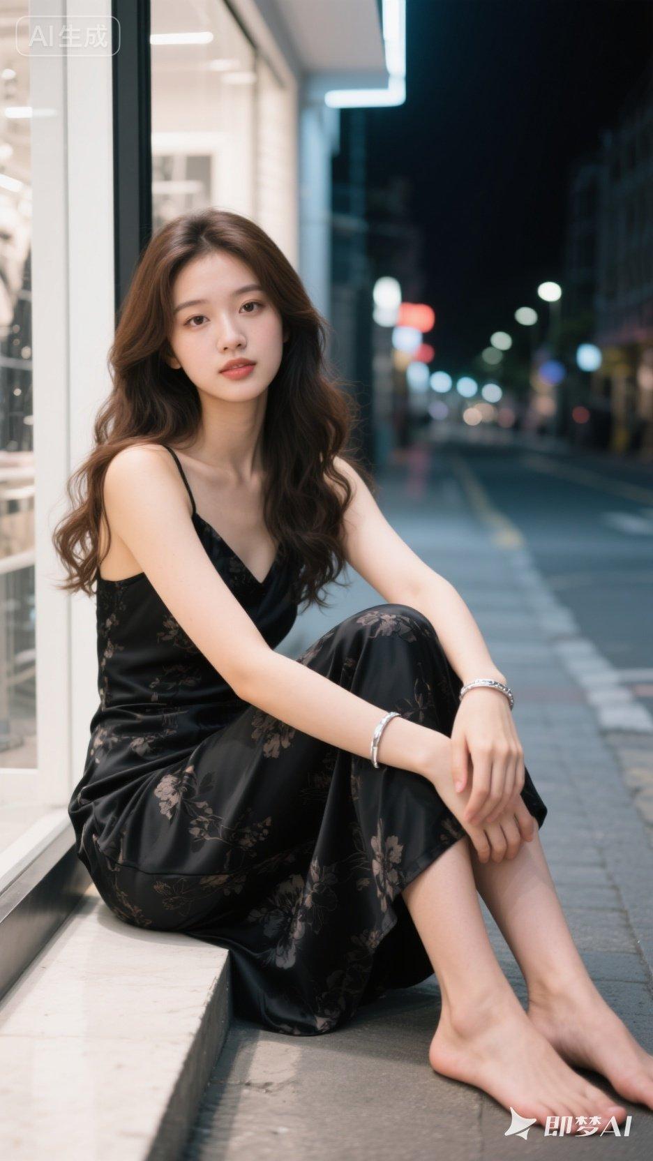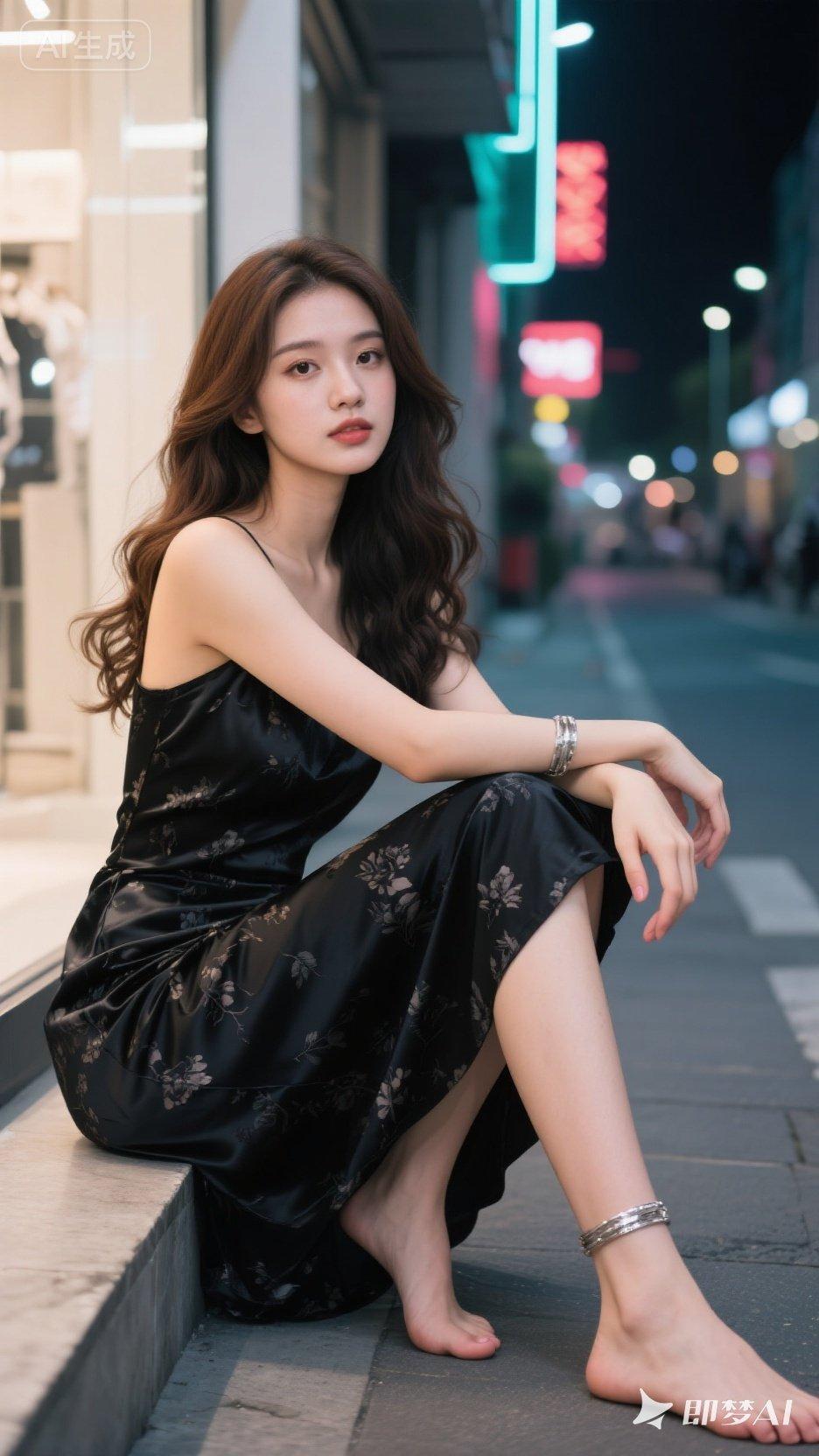 夜晚街头的优雅少女,黑裙与霓虹灯交相辉映,散发迷人魅力。