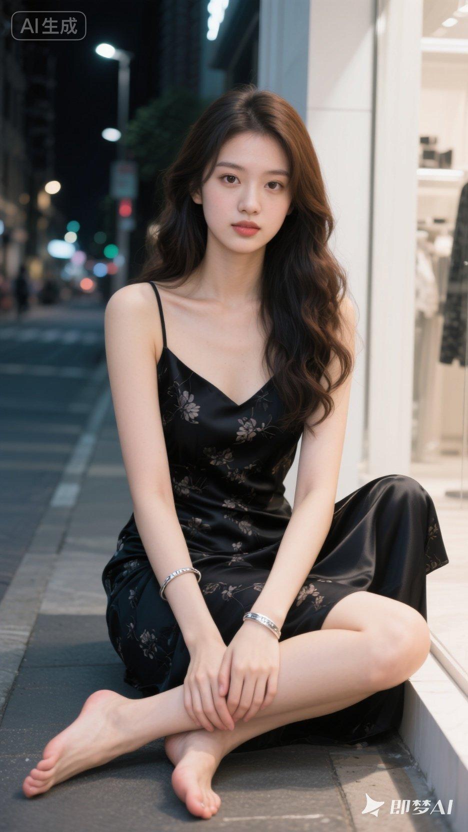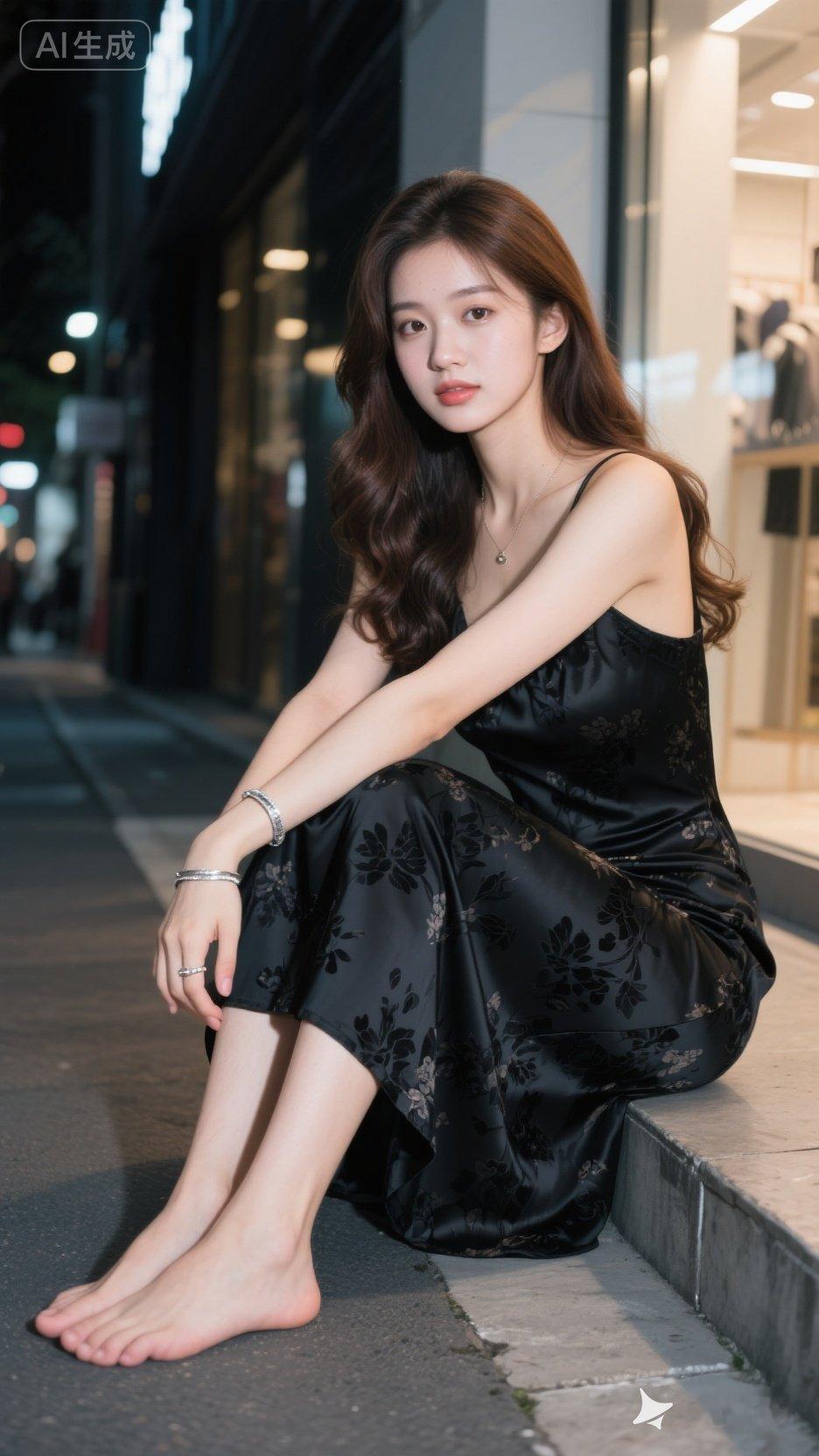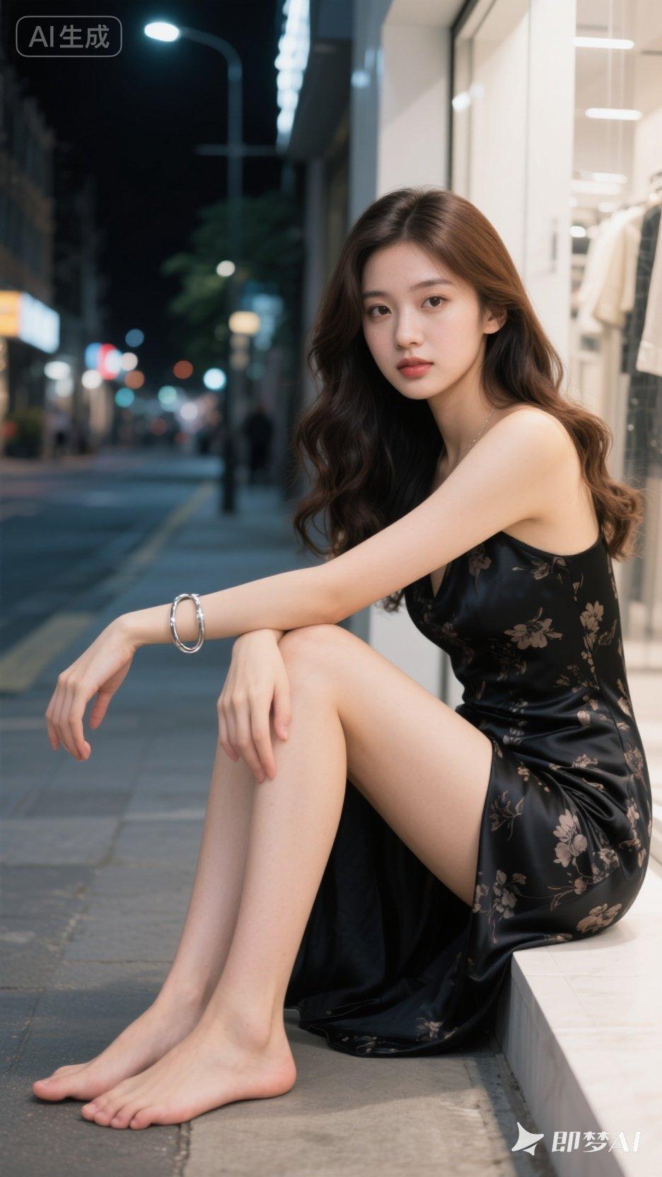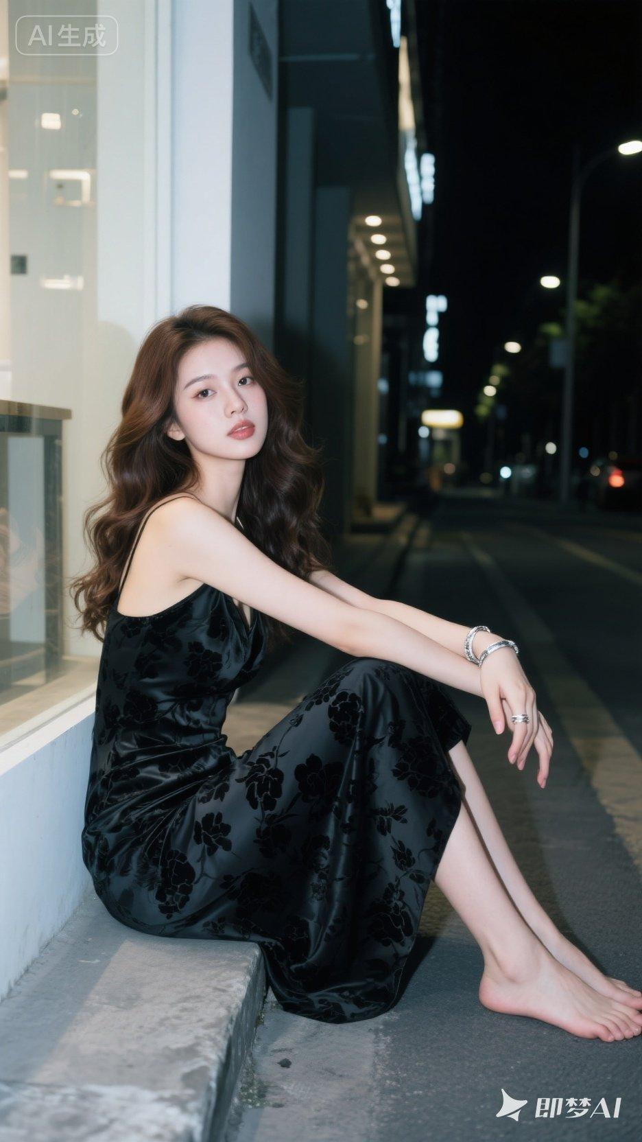 夜晚街头的优雅少女,黑裙与霓虹灯交相辉映,散发迷人魅力。
