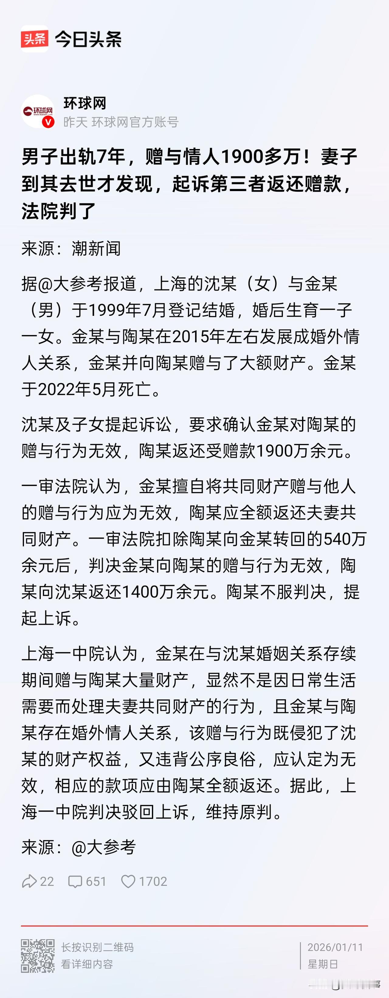 “家花没有野花香?”上海,男子和妻子结婚16年后,终于耐不住寂寞,背着家人在外找了情人。和情人相处的7年间,男子还陆陆续续向对方转账1900万元,直到男子离世后,妻子才知道丈夫出轨并转款的事实。气愤之余,她以丈夫赠与情人财产的行为无效,便将情人告上法院要求返还。案件经过两审,结局不出所料。 1999年,沈女士和丈夫金某携手步入婚姻的殿堂。 婚后两人并肩打拼,生意越做越大,日子越过越红火,还育有一双儿女,在外人眼里,这就是妥妥的幸福家庭模板。 本以为两人能这样携手相伴到老,可谁曾想,沈女士竟遭遇了背叛。 2022年5月,金某突然离世。沈女士在整理丈夫遗物时,发现了惊天秘密:自2015年起,丈夫竟断断续续给一个叫陶某的女人转了1900万余元。 经查实,陶某正是丈夫的婚外情人。 沈女士怎么也没有想到,平日里对自己敬爱有加的丈夫居然是这种人。 悲痛又愤怒的沈女士觉得事情不能这样就算了,随即她带着子女起诉,要求确认赠与行为无效,让陶某返还全部款项。 那么,沈女士能得偿所愿吗? 在这里,我们要知道夫妻婚后的工资、生意收益等都属于夫妻共同财产,是不分份额的共同拥有,不是说谁赚得多就能随便处置。 沈女士和金某的财产是两人一起奋斗来的,每一分都有沈女士的份,金某在未经沈女士同意的情况下是没资格单独送给情人。 再者来说,根据《民法典》规定,涉及大额财产处置时,必须夫妻商量一致。而像日常生活中买菜、交学费这类日常开销,夫妻一方则有“家事代理权”,一方说了算就行。 显然,金某向沈女士转出的1900万远超日常开支范畴。金某瞒着沈女士转账,本身就是越权行为。 最关键的是,金某的这种赠与还违背公序良俗。 《民法典》明确规定,违背公序良俗的民事行为无效。 金某用夫妻共同财产来维系婚外情,既违反夫妻忠实义务,也破坏家庭伦理,无论如何在法律上也是不会被认可的。 所以,陶某应当向沈女士返还全部赠与的钱款。 因陶某此前向沈女士转回了540万元,法院最终判决陶某还需向沈女士返还1400万元。 一审过后,陶某不服,又上诉。二审驳回其上诉,并维持了原判。 对此,有人存在质疑,觉得这样的结果对情人来说不太公平,毕竟人家也有付出,钱也是金某自愿给的。 那么对于这种观点,完全是颠倒了黑白!明明是情人不讲道德,金某花的钱也是沈女士的夫妻共同财产,为什么让沈女士为情人不道德的行为买单呢? 正如有网友说的那样,这样判,大快人心!这样判,符合公序良知!让“小三”一无所获,也有助于警示后人切勿破坏别人家庭。否则,到最后,只会落得个“竹篮打水一场空”的下场。 对此,你怎么看?欢迎大家在评论区留言。