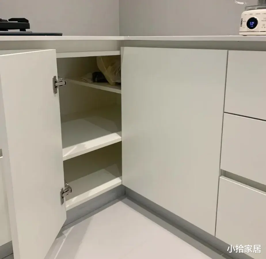 如果你对厨房的收纳要求比较高,我倒建议你将橱柜转角处的门板,做成对开门结构,内部不管怎么设计,日常收纳时都会很方便。
