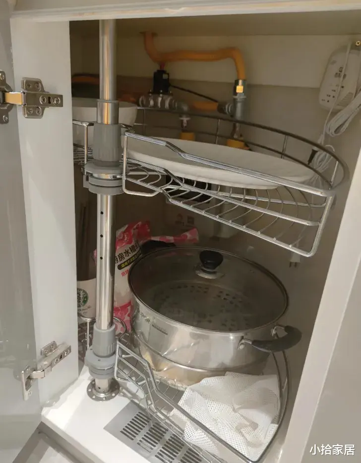 五、橱柜旋转拉篮橱柜里最不好用的空间,就是90度转角区了。为了解决这个问题,大多数家庭都给转角安装上了旋转拉篮。