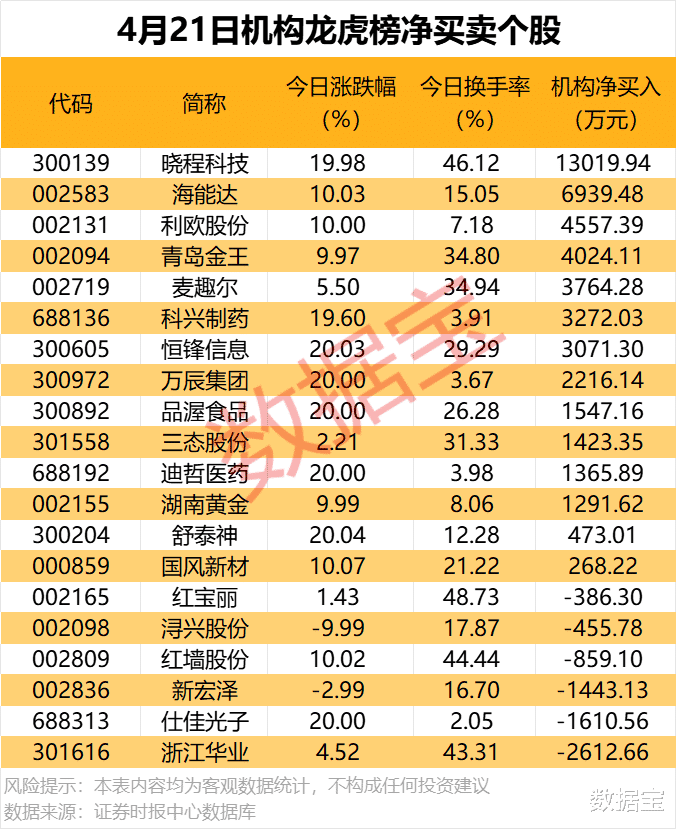 4月21日龙虎榜中,共14股获机构净买入,晓程科技获机构净买入1.3亿元,净买入居首,海能达、利欧股份、青岛金王等均获机构净买入超4000万元。
