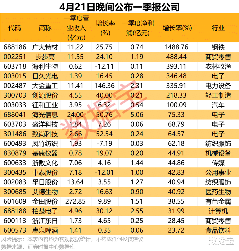 截至18:00,今日晚间已有50余家公司发布一季报,预计一季度净利润增幅最高的是广大特材,净利润同比增长1488.76%,公司认为主要系行业需求整体向好,产销两旺,营业收入同比实现较好增长;内部产品结构调整,工艺优化降本增效,毛利率逐步修复等。