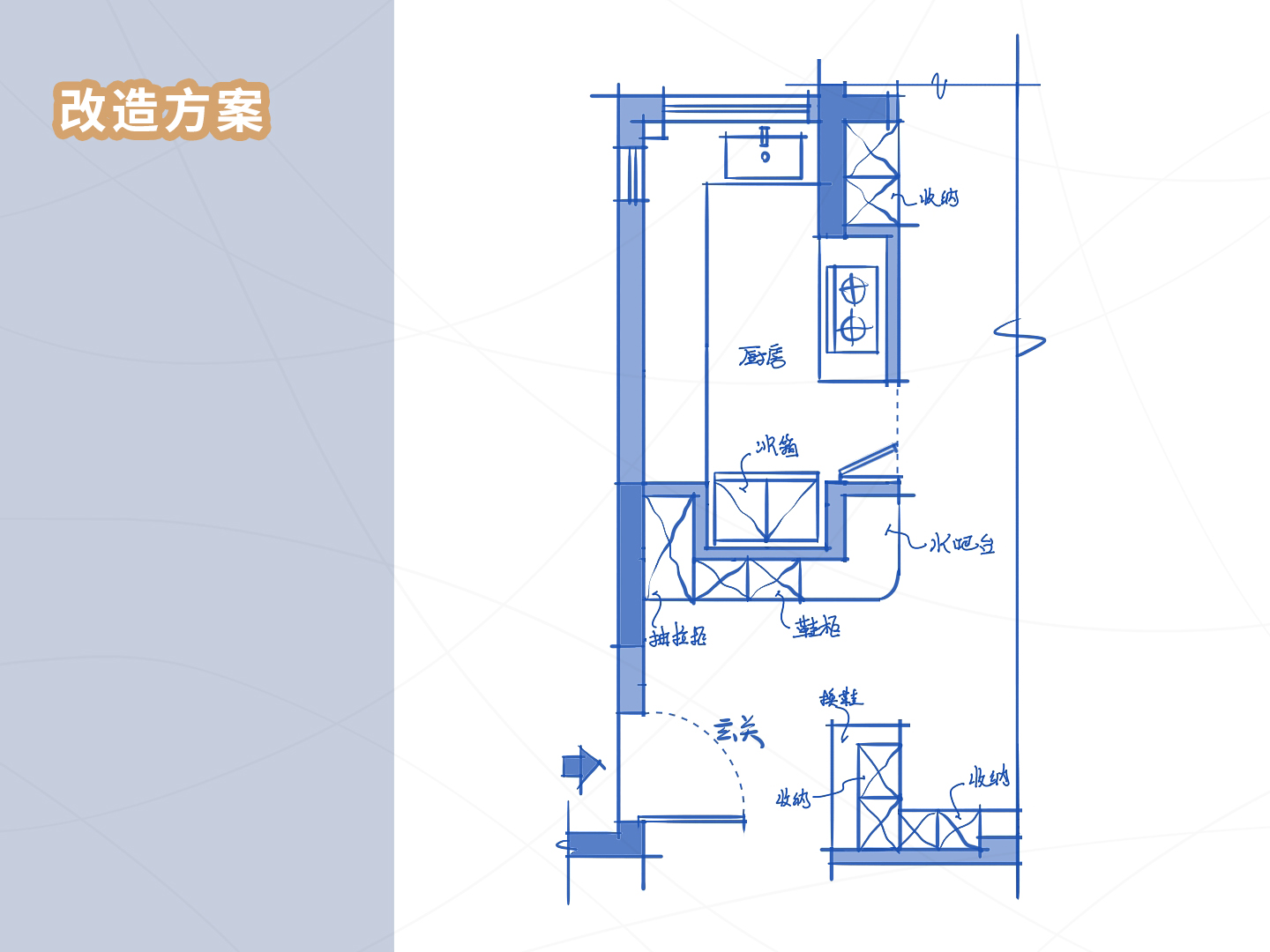 先看原始方案,对于这样的厨房改造,已经不能只单纯的考虑单一空间的优化,还要结合周边空间的整体规划才能出效果。我们可以发现厨房周边区域的安排也有很多问题,阳角多、规划凌乱不整洁,空间有种杂乱的感觉。