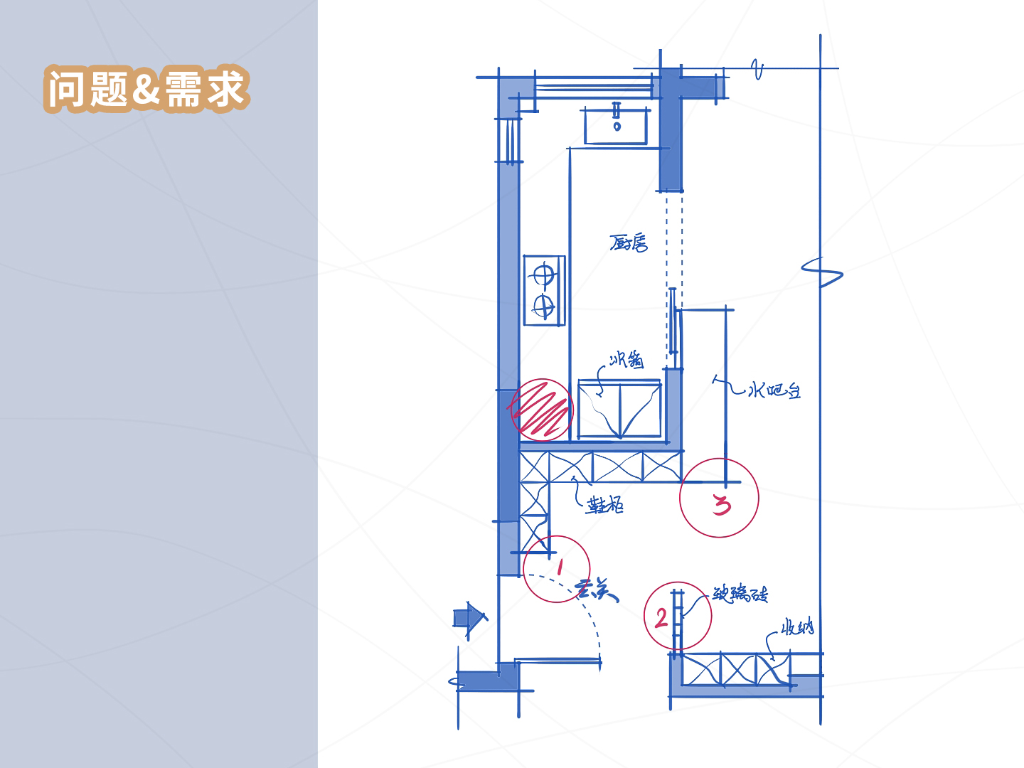如果要保留水吧台的话,可以缩短水吧台,把玄关的玻璃砖屏风改为结合换鞋凳的收纳造型,与水吧台对齐,使空间更整洁;