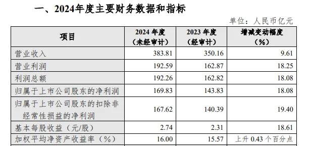 业绩快报显示,去年归母净利润为169.83亿元,同比增长18.08%,增速呈现进一步放缓态势。