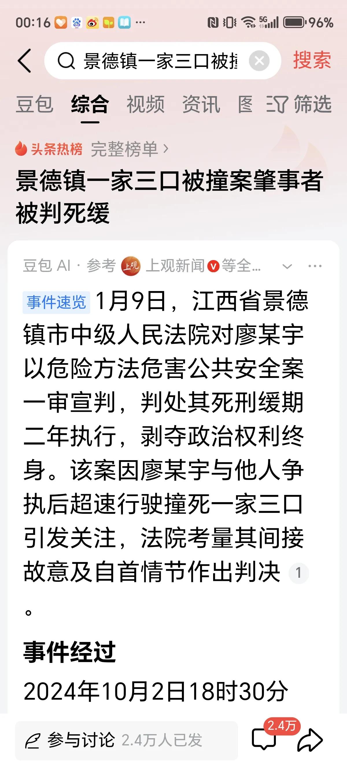 如果这个廖某宇被判死缓成立,那这枉死的一家三口,死者的爸爸妈妈,儿媳妇的爷爷奶奶,不到1岁的婴儿都太不公平了! 跟女朋友吵架不是追索别人生命的理由!市区时速128.9km,这是夺命飞车呀!难道他没有看到一家三口过马路吗? 而廖某宇的父亲还在法庭上叫嚣着赔偿80万,要打被害方的律师 这种戾气不能纵!你生气就该夺无辜人的生命吗? 网友评论: 景德镇的法律法规就像他们的瓷器一般脆弱,只能看,不能使用,一用就散碎一地! 廖某父亲不满意法院判决的 可能是一百多万花出去了 没有达到预期的效果 法律是人定的,如果一些法律条款不公平,人可以推翻法律让它公平和正义 看一个国家的文明,只消考察三件事:第一看他们怎样待小孩子;第二看他们怎样待女人;第三看他们怎样利用闲暇的时间。” 当前受西方资助的法学者,中了白左的毒,不去看受害者的惨,却拿显微镜找施暴者的减刑依据,这是纯粹的坏,站在人民对立面,迟早遭报应。