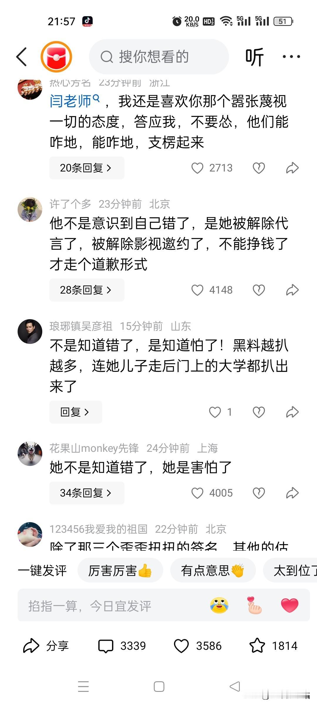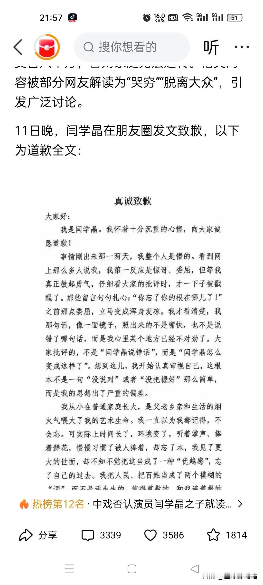 评论里面几乎都是一边倒!这太让我"惊讶而又失望"。一个人真心实意的悔过并真诚致歉,竟然说都是怕丢了饭碗丢了代言,难道都已经那么龌龊到不懂得相信别人改过自新的机会?难道不能在如此冲击下让自己如梦初醒?发现自己错了?发现被以往的阿谀奉承蒙蔽了双眼了? 我希望大家能给予别人认错的机会,有错就改就是"好同志"! 己所不欲勿施于人!你有没有认真想过一个问题:当这件事发生到你的身上,你是发自内心的的知道错误,但别人都觉得你假的时候!你是不是像被刀子捅了一样难受。就像别人一句谣言,你为了证明自己清白跑断腿。还是那句话:"我们都是被自己欺骗的人,认真的反省自己吧!我现在觉得她比我们好,起码被打醒了,知道自己的错,然后去寻找初心!我们呢!"中戏否认演员闫某晶之子就读新疆班