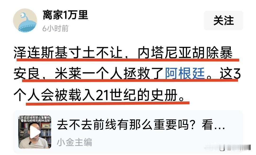 泽连斯基寸土不让,内塔尼亚胡除暴安良,米莱一个人拯救了阿根廷!这三人将被载入21世纪历史史册。 网友这段话,是对三人的最大肯定与奖赏!虽然用词有些不准确,但从一个侧面,说出他们各自的贡献。 苍狼不想多加评论,因为事实在那里摆着,谁能否定得了呢?但凡站在文明正义立场,都会如此认定吧? …………
