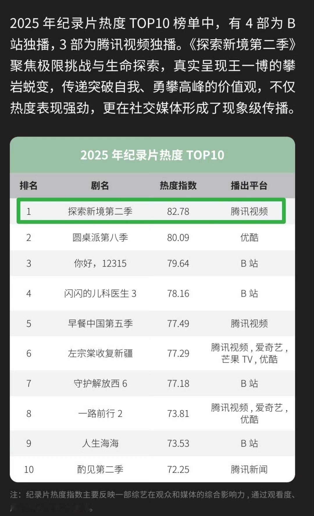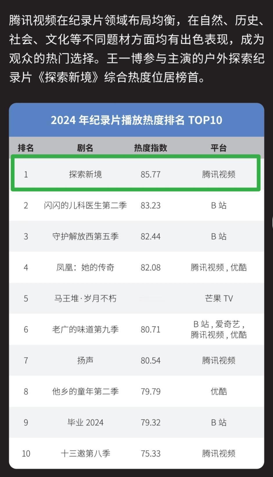 王一博作为发起人的个人ip户外探险纪实纪录片《探索新境》,两年两季,两年都拿纪录片播放热度top1。 “不仅热度表现强劲,更在社交媒体形成了现象级传播”! 这是属于王一博的独一无二的强大个人ip,和王一博自身具有的鲜明、无可替代无法复制的个人特质。 内娱,唯一。 王一博