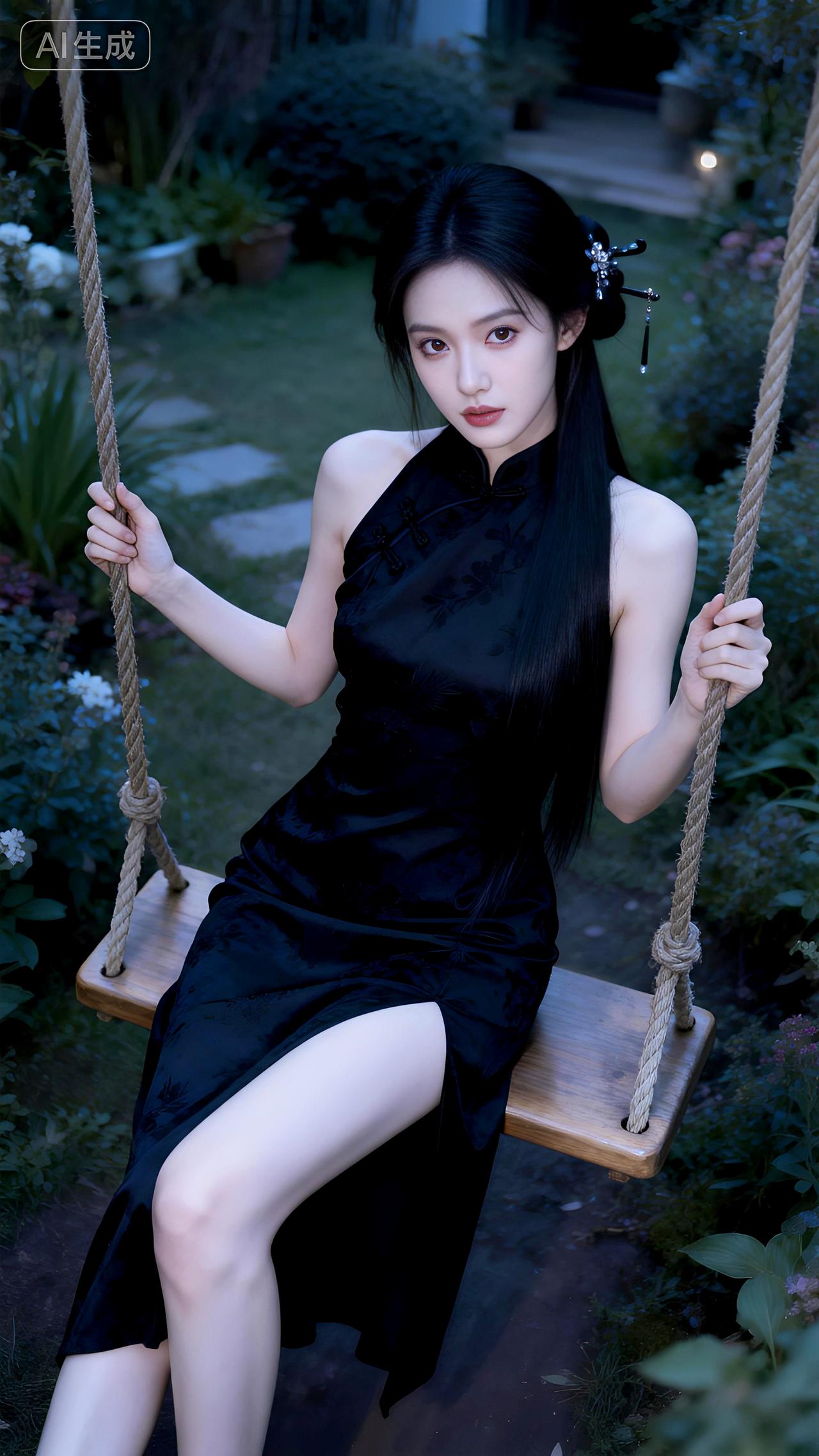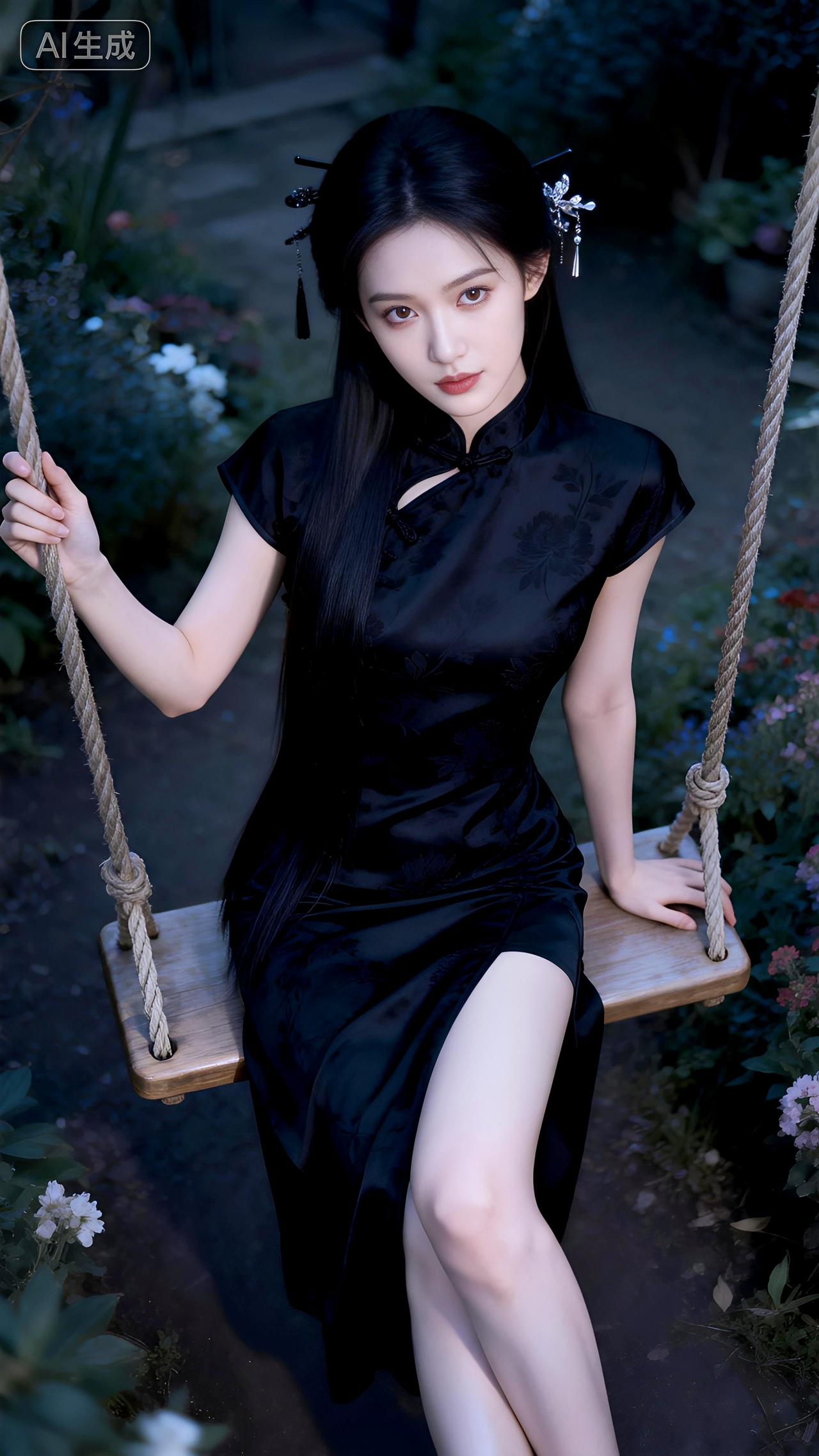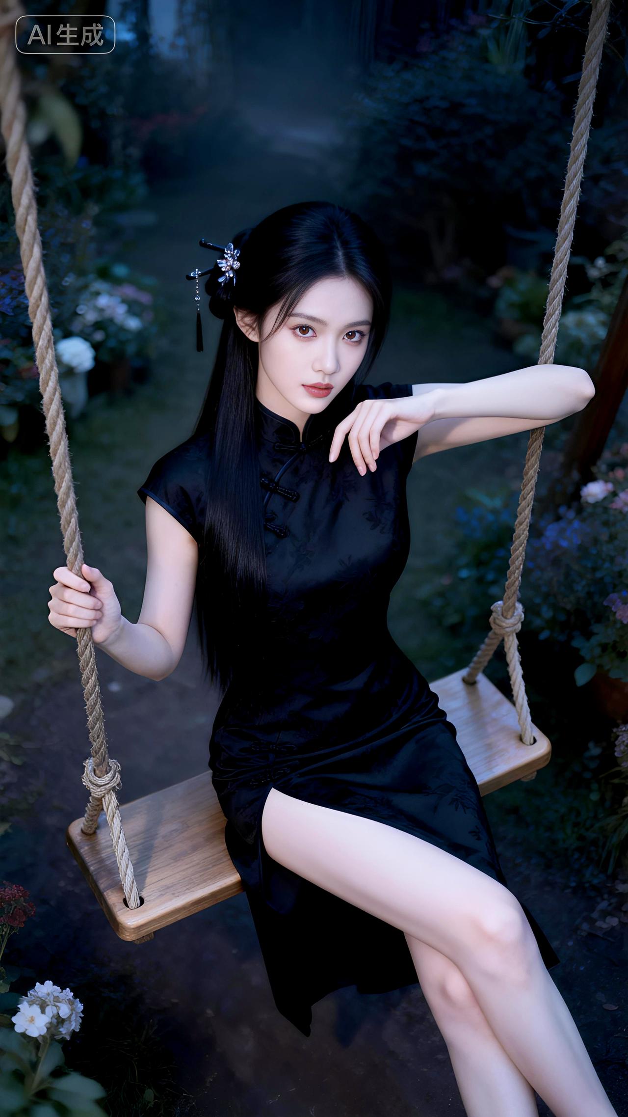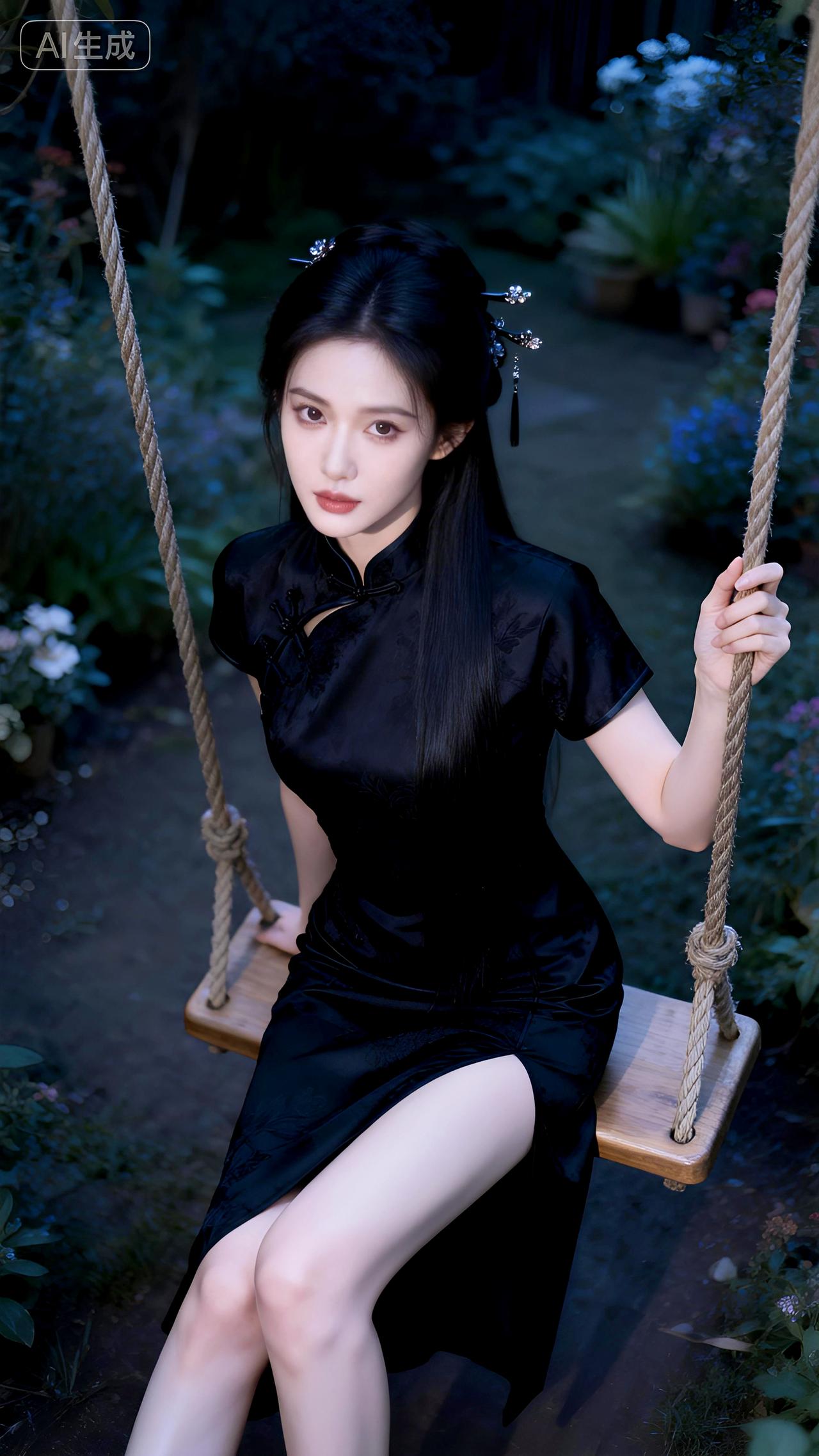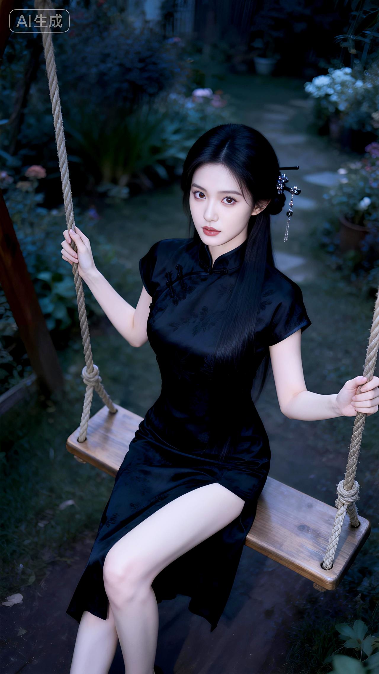 秋千影动暗香浮,墨染旗袍倚阑处。豆包 写真 壁纸