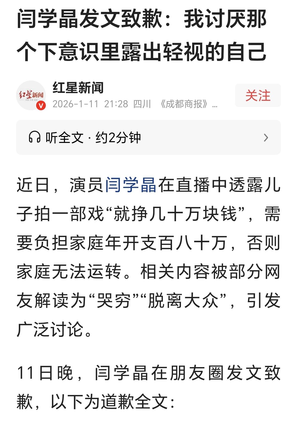 闫学晶的道歉信来了!写的情真意切,深刻地检讨了自己,其中一句话我很认同。 虽然只是一份迟来的道歉信,但她还是道歉了。 如果她能在这场风波初起之时就这样公开道歉,或许佐香园也不会和她解除合约。 为什么没早点道歉? 在道歉信中,闫学晶首先提到一点原因,说她在事情刚出来的一两天“整个人都是懵的”。 这个解释略显牵强。 就算她确实有点“懵”,她团队的人或者家人、朋友,就没有提醒她是否考虑道歉吗? 话说回来,事情出来一周过去了,也没见她道歉呀! 总不至于“懵”了这么久吧? 在这份道歉信中提到,当她说那些话的时候,她对基层民众的敬畏和尊重就已经蒙了灰,忘了自己的根基。 按她自己的分析就是,在鲜花和掌声中待久了,她就慢慢地习惯了被人捧着,忘了本。 不得不说,在份不怎么短的道歉信中,闫学晶确实比较深刻地剖析了自己的内心,进行了深刻的反省,向网友们诚恳道歉了。 有的网友说,她不是知道错了,她是害怕了。 怕什么呢? 怕失去,怕承担责任,还是怕没有了演艺事业的未来? 有的网友说,金无足赤,人无完人,孰能无过?得饶人处且饶人。 虽然有可能是迫于压力她才道歉的,但也有可能她确实认识到了自己的错误,是由衷的道歉。 有的网友给她建议说,道歉之后应该低调做事,多做善事,慢慢地争取网友们的原谅。 对于闫学晶迟来的道歉,各位怎么看?