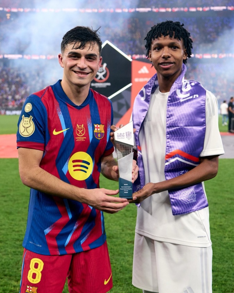 直播吧1月12日讯西超杯决赛,佩德里助攻莱万破门,巴萨3-2击败皇马,捧起冠军奖杯,赛后佩德里接受了媒体的采访。