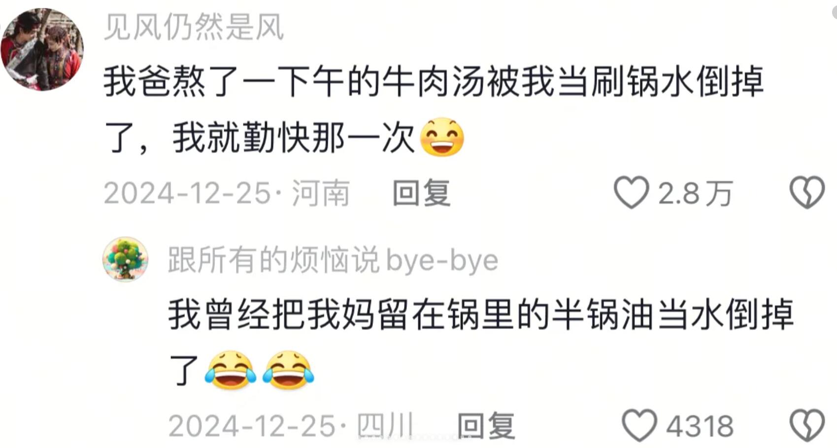 我爸熬了一下午的牛肉汤被我当刷锅水倒掉了,我就勤快那一次