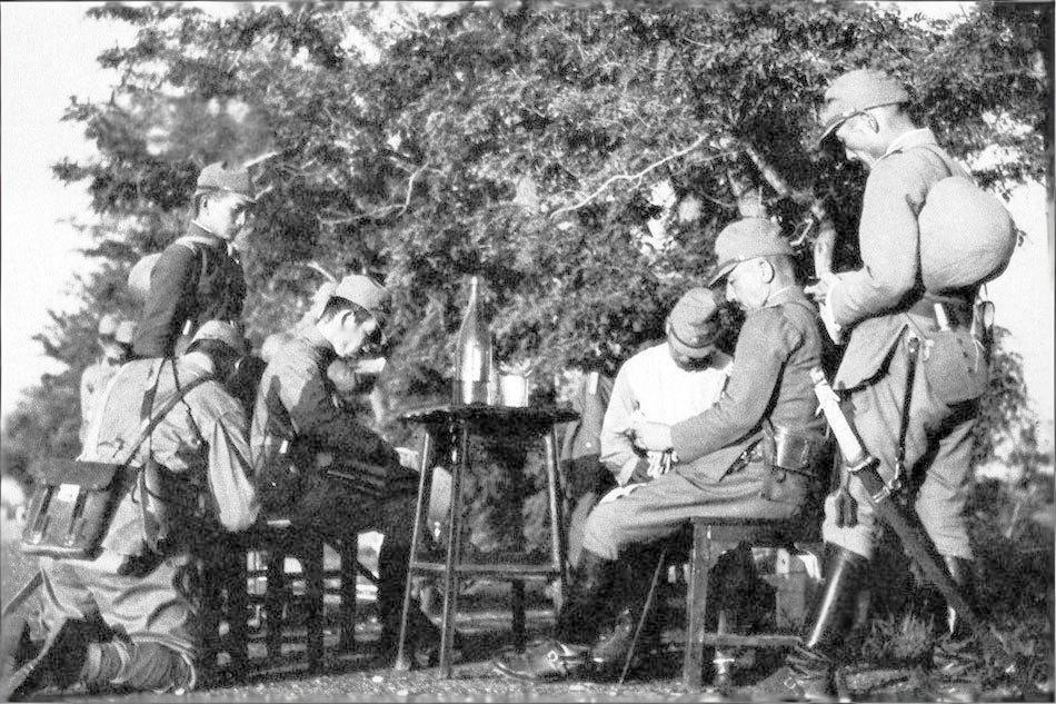 1937年7月,卢沟桥事变爆发后的前线,五六名日军军官及士兵围坐在树荫下的简易野餐桌旁。中央坐着的年长军官正低头专注地阅读文件,桌上摆放着酒瓶,可能是清酒、饭盒、杯子等,气氛看似悠闲。 1937年7月8日~中旬,卢沟桥东岸或宛平周边日军临时休息点。事变爆发后,日军迅速推进,占领部分村镇,这张照片很可能由随军记者拍摄,他们自认为装备精良、训练有素,认为中国军队不堪一击,因此敢于在前线“野炊”休憩,甚至摆拍宣传“皇军从容”。