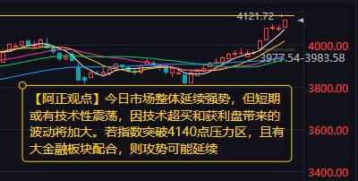 【1月12日A股盘前分析:今日市场整体延续强势】 周五沪指16连阳站上4100点,周线4连阳;成交暴量,历史上第5次突破3万亿。本周市场暴量难以持续、指数有可能加剧波动…… 【今日分析】今日市场整体延续强势,但短期或有技术性震荡,因技术超买和获利盘带来的波动将加大。 预计本周市场还会出现上冲过程,目标剑指4150-4180点区间,但难言周线5连阳。前半周与后半周有翘翘板动作,整体看不排除“N”型走势的出现,回踩的低点大致在4050点附近。 总体趋势:当前市场处于强势趋势下的震荡整理期。主要指数已累积较大涨幅,多项技术指标显示超买,存在修复需求,市场波动可能加剧。 指数层面:上证指数上行的压力位看4137-4140点附近;下行的支撑位看4100-4080点附近。 热点方向:关注半导体、AI(算力/应用)、商业航天、机器R;有色金属(涨价预期)、化工、机械、券商。消费(受益春节服务方向)。 操作策略:持仓为主,避免追高、均衡配置。上攻时,若指数突破4140点压力区,且有大金融板块配合,则攻势可能延续;回调时,若指数回踩4100-4080支撑区域且企稳,可视为对仓位进行结构性优化的机会。 注意事项:观察市场量能能否维持,以及大金融板块能否发力配合指数突破。 【综合判断】今日市场整体延续强势,但短期或有技术性震荡,因技术超买和获利盘带来的波动将加大。若指数突破4140点压力区,且有大金融板块配合,则攻势可能延续;若指数回踩4100-4080支撑区域且企稳,可视为对仓位进行结构性优化的机会。 我写精品,你来点赞,相互支持、携手共进。 (个人观点,仅供参考,据此操作,责任自负)