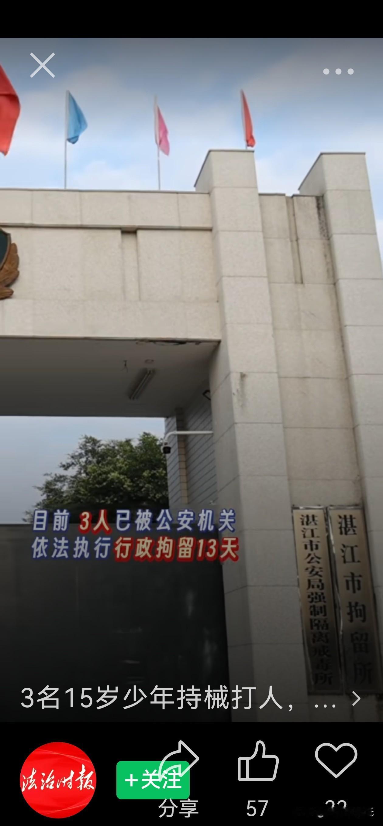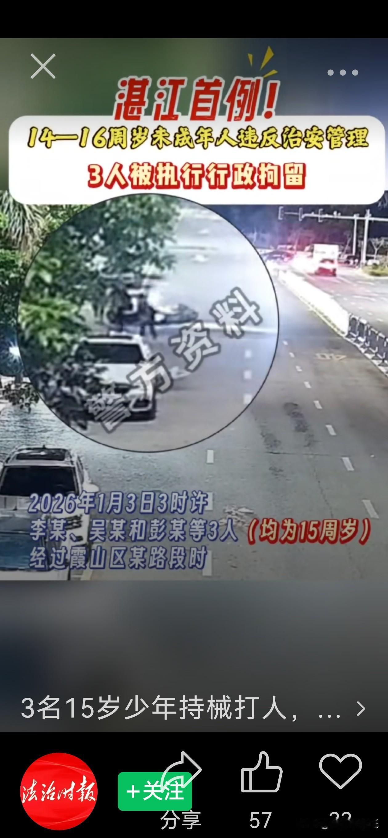 全国首例!3名15岁少年被行拘——新法修订后,年龄不再是“护身符”! 1月3日凌晨3时许,李某、吴某、彭某(均为15周岁)途经湛江市霞山区某路段时,持械追打他人,造成受害人轻微伤,涉嫌寻衅滋事——三个15岁少年以为“年纪小就没事”,却在当天21时全部落网。湛江警方果断出手,依法对三人执行行政拘留13天。此案成为2026年新《治安管理处罚法》施行后,全国首例对14至16周岁未成年人行政拘留的案例! 本案的重大意义在于,新修订的治安管理处罚法对未成年人违法处罚条款作出调整,改变了以往对14至16周岁未成年人违法不执行拘留的规定。关键点在于:新法已改!以往该年龄段“只教不拘”成为历史,如今情节严重、影响恶劣或一年内两次违法的,即可依法拘留。其中一名少年彭某被抓后懵然说:“我忘记1月1日14岁就可以拘留了。” 这一句“忘了”,正是此案最沉重的警示。法律不是儿戏,修订不是为了严惩,而是为了划出更清晰的红线。青春不是违法的保护伞,守法意识必须从小筑牢。此案如同一声惊雷,明确告诉所有人:法律威严从不“休眠”,年龄绝不是逃避责任的借口!