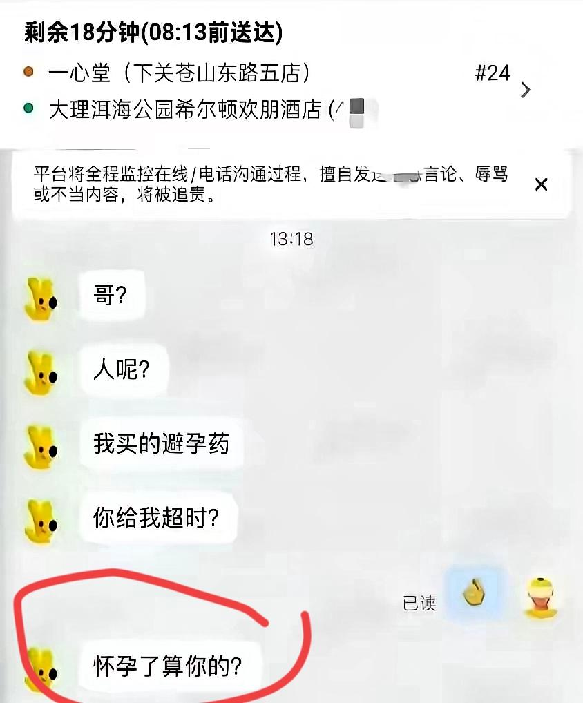 跨年夜17分钟的延迟,竟让杭州姑娘对着骑手喊出“怀了算你的”,这波甩锅真是把成年人的担当丢得明明白白! 紧急避孕药72小时内都有效,晚十几分钟根本不影响核心效果,姑娘的愤怒,分明是自己没做好安全防护的焦虑转嫁。 亲密关系里的安全措施本是必修课,临时外卖买药就已是侥幸,却把风险责任推给熬夜奔波的骑手。 跨年夜谁不想团圆?骑手可能正顶着拥堵路况、扛着多单压力赶路,平台都早有“超时免罚”的柔性规则,体谅他们的不易。 可姑娘不管这些,把自己的疏忽变成对打工人的苛责,本质是边界感缺失,更是缺乏担当。 成年人的世界从没有“理所当然”,自己的选择就得自己扛。安全防护要提前做,遇到意外先冷静,而不是迁怒无辜者。 多份理解少点戾气,才是人与人之间该有的分寸。 如果你遇到配送延迟,会怎么沟通解决?