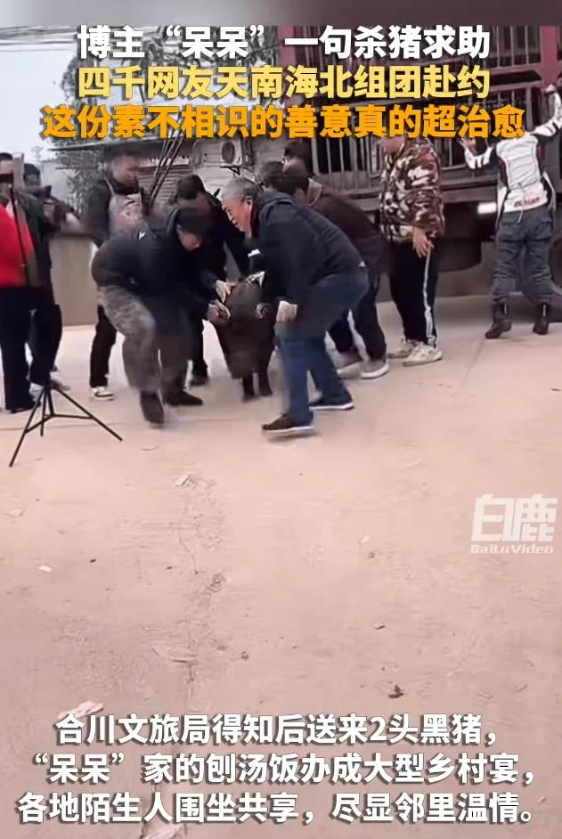 呆呆“呆”了,猪没命了。重庆合川火了。 女孩呆呆要杀年猪,诚请网友帮忙按猪,没想到网友积极性超高,第二天村里的小路就被车辆堵得水泄不通。合川文旅接住了这一泼天流量,不仅现场维持秩序,更免费赠送两头大肥猪,呆呆在自家开了“流水席”,杀完年猪当场就做杀猪菜,就当提前过年了。 就想问,这些网友都不用上班的吗?合川文旅开心了,两头猪就把旅游带动起来了。 建议合川文旅趁势举办合川年猪节,推广出去,每年都举办一次,把这波流量延续下去。