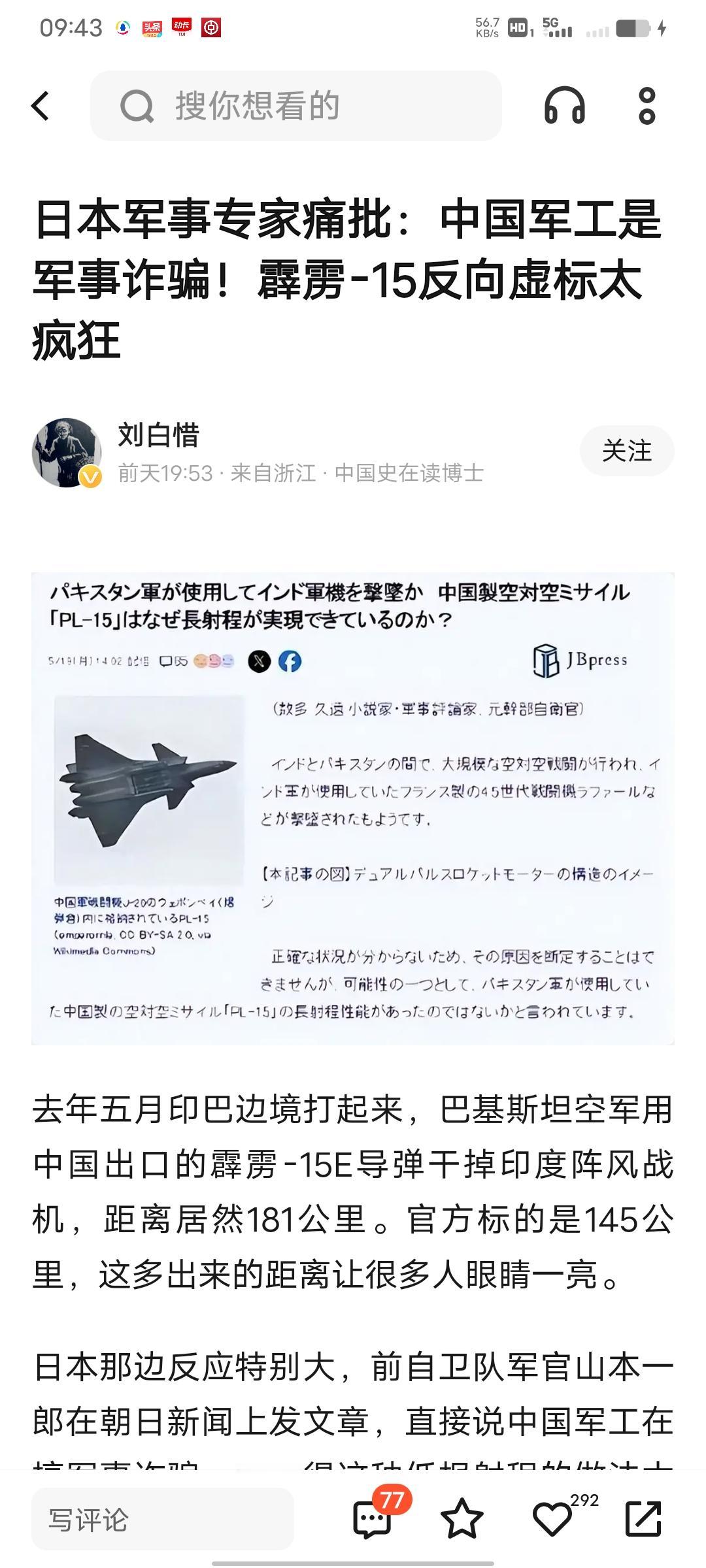 小日本军事专家跳脚痛批中国军工“军事欺骗”,说霹雳 -15 反向虚标太疯狂。咱就来掰扯掰扯,中国对外宣称霹雳 -15E 射程 145 公里,可印巴冲突里 181 公里外就轰掉“阵风”战机。这能叫虚标吗?这是实力太猛藏不住。 再看看美国的 AIM -120D,标 160 公里,实战打战斗机有效杀伤只剩 70 公里,宣传和实战差距大得离谱。西方军火商爱吹牛,为骗预算,让金主觉得“值”。而中国是低调有实力,小日本专家这是吃不到葡萄说葡萄酸,咱霹雳 -15 的真实实力,可不是他们能随便诋毁的。