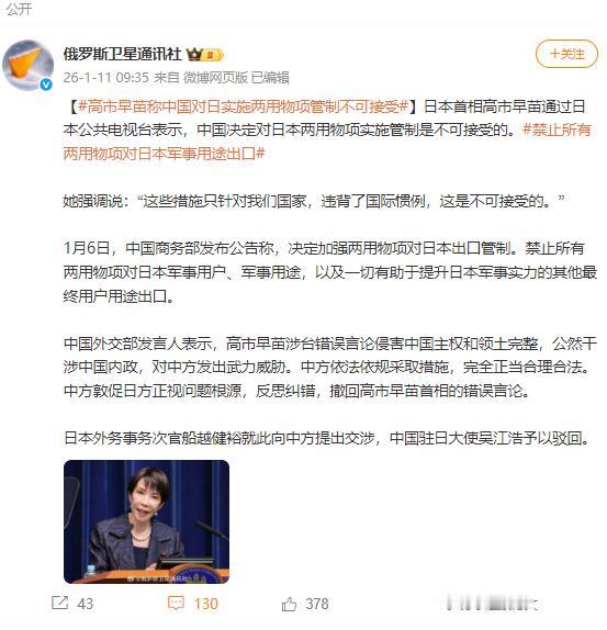 日本首相高市早苗通过日本公共电视台表示,中国决定对日本两用物项实施管制是不可接受的。   她强调说:“这些措施只针对我们国家,违背了国际惯例,这是不可接受的。”   显然,日方要求中方撤回该措施的努力失败了,所以高市不得不站出来发声。   高市早苗政府所谓“措施只针对日本”的说法,刻意模糊了中方行动的核心指向——不是针对日本这个国家,更不是针对正常的民用贸易,而是精准指向那些可能助力日本军事扩张的物项和用途。   这一切的导火索,是高市早苗本人及日本右翼势力的持续挑衅:不仅在台湾问题上发表不当言论,公然干涉中国内政,甚至释放出武力介入的信号,这种触碰中国核心利益的行为,早已突破了国家间相处的底线。   更值得警惕的是,日本的防卫预算正持续暴涨,2026财年的总额已达9.04万亿日元,较2018财年增幅接近70%,军力扩张的野心昭然若揭。在这样的背景下,中方若放任两用物项流向日本军事领域,无疑是对自身安全的漠视,任何主权国家都不会坐视这种风险持续累积。   所谓“违背国际惯例”的指责,更是站不住脚的强词夺理。对两用物项实施出口管制,本就是国际社会维护国家安全和履行防扩散义务的通行做法,美欧等主要国家都在践行这一原则,瓦森纳安排等多边机制也早已将相关物项纳入管制范围。   中方的行动完全有据可依,既符合《中华人民共和国出口管制法》《两用物项出口管制条例》等国内法规,也契合WTO规则中的“安全例外”条款,世贸组织相关官员也明确表态中方措施符合国际规则。   更关键的是中方已明确划出边界:管制仅针对军事用户和军事用途,涉及正常民事用途的贸易不会受到影响,这种精细的区分恰恰体现了对国际惯例的尊重,与日方此前泛化管制、阻碍正常经贸合作的做法形成鲜明对比。   日方之所以急于要求撤回措施,核心在于中方的管制精准击中了其“寓军于民”体系的要害。日本战后清算不彻底,许多企业源于战前财阀体系,虽披着民用企业的外衣,却长期深度参与军事技术研究和装备生产。   三菱重工、三菱电气等企业早已成为日本防务订单的核心承包商,就连频繁干扰中方演训的F-15战斗机,也是由三菱重工授权生产的。而这些军工生产高度依赖从中国进口的两用物项:端羟基聚丁二烯是导弹推进剂的关键原料,钨粉可用于制造穿甲弹芯和航空发动机,稀土更是雷达、制导系统等尖端装备不可或缺的基础材料。   中方的管制相当于切断了日本军工体系的“原料命脉”,这才是高市早苗政府急着发声的真正原因。   从经贸互动的脉络看,中方的措施更是对日本长期遏制行为的合理反制。早在2023年,日本就加入对华半导体出口管制阵营,限制23种先进制造设备出口,2024年又进一步扩大清单、收紧审批,导致东京电子等企业在华营收大幅下滑。   2025年中方对镓、锗实施管制后,日本半导体供应链已遭受冲击,此次覆盖900余种物项的管制,更是让日本产业界陷入恐慌。   据测算,若稀土等关键矿产供应中断,日本实际GDP可能下降1.3%至3.2%,运输机械行业产出降幅或达17.6%,就业人数也将减少近百万。这种后果并非中方刻意为之,而是日本追随美国遏制中国、损害中方利益的必然结果。    高市早苗政府的抗议和指责,终究掩盖不了自身的理亏之处。中方的措施不是“突然出手”,而是在日方多次无视警告后的必要回应;不是“违背惯例”,而是遵循国际规则的正当行动;不是“针对民用”,而是精准打击军事扩张的风险源头。日方要求撤回措施的努力失败,本质上是其错误行径得不到国际社会认可的体现。   当前日本产业界已出现减产、库存告急的困境,全球供应链也在随之重构,这些现实都在警示日方:试图以政治私利绑架经贸合作、以军事扩张挑战地区安全,最终只会反噬自身利益。中方始终敞开对话的大门,但前提是日方正视错误、撤回不当言论,否则后续反制措施的升级只会让日本付出更沉重的代价。