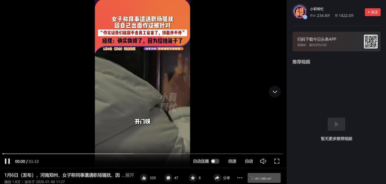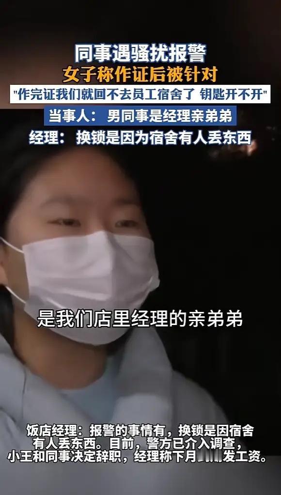 “冤不冤!”近日,河南郑州,一女子同事被职场骚扰,出于正义女子出面帮同事作证,没想到作完证后就发现员工宿舍进不去了,钥匙也打不开,想到骚扰同事的男子是上司的亲弟弟,这让女子不得不怀疑自己被针对了!网友:明目张胆的报复! 本来女子的日子过得平平静静,每天在饭店上班、回宿舍休息,直到前几天饭店里的一场风波,彻底打乱了她的生活,那天店里的一位女同事遭到了男员工的职场骚扰,女同事躲都躲不开,最后实在没办法,只能选择报警求助。 而这位女子刚好全程目睹了事情的经过,她没像其他人那样选择“事不关己高高挂起”,更没因为怕惹麻烦就沉默,看着同事受委屈,她心里很不是滋味,当下就决定陪着女同事一起去派出所,帮着警方还原事情的真相。 这一去就是一整晚,做笔录、配合调查,忙得脚不沾地。女子本来就熬不住,加上心里也替同事揪着心,等到事情处理得差不多,天快亮的时候才拖着疲惫的身体往宿舍走。 那时候她累得都快站不稳了,脑子里就一个念头,赶紧回到宿舍倒头睡一觉,可万万没想到,当她拿出钥匙准备开门时,诡异的一幕发生了,钥匙怎么都插不进锁孔,试了好几次都没用。 一开始她还以为是自己太累了,手发抖没对准,又仔细调整了姿势试了几遍,结果还是一样,这时候她才后知后觉地意识到,不是自己的问题是锁出问题了。 她使劲敲了敲宿舍门,里面没人应答,周围的同事要么还在上班,要么还在休息,根本没人过来帮忙。她凑近仔细一看,瞬间倒吸一口凉气:锁芯竟然被人偷偷换了! 好好的门锁,怎么突然就被换了?女子心里满是疑惑,可当她把时间线捋了一遍,一个可怕的猜测在脑海里浮现,这锁会不会是因为自己帮同事作证,被人故意换的?毕竟这锁坏得太巧了,偏偏在自己陪着同事去派出所、得罪了那个骚扰者之后,自己就进不去宿舍了,这个时间点的“完美巧合”,让她不得不往报复这个方向想。 就在她越想越心慌的时候,一个关键的人物关系浮了出来,让整件事的逻辑瞬间清晰了,那个在店里骚扰女同事的男员工,竟然是饭店经理的亲弟弟!这一层关系一揭开,女子心里的猜测就更肯定了:肯定是因为自己指证了经理的弟弟,经理故意换了锁,就是想给她穿小鞋,报复她多管闲事。 上司的弟弟被指证骚扰,作证的员工转头就被换了宿舍锁,连门都进不去,这其中的猫腻,就算是外人也能一眼看穿,女子越想越委屈,自己明明是出于正义,看不惯恶行才站出来作证,没做错任何事,结果却遭到这样的针对,她的个人物品还都锁在宿舍里,现在进不去门,东西拿不出来,连个休息的地方都没有,这种被针对的感觉,比熬了一整晚的疲惫更让她难受。 委屈归委屈女子没打算忍气吞声。她觉得自己没做错,不能就这样被欺负,于是直接找来了媒体,把这件事曝光了出来,想让大家评评理,也想扯开这层暗箱操作的遮羞布。 记者跟着女子找到饭店经理,追问换锁的事情,经理倒是直接承认了锁是他换的,但给出的理由却让人觉得特别滑稽,明显是在硬凑借口。 经理说,换锁不是为了报复作证的女子,而是因为当天早上有其他员工反映宿舍里丢了东西,为了大家的安全,才“顺便”把宿舍锁换了,可这个理由在事实面前根本站不住脚,就算真的是为了防盗,正常的流程也应该通知所有住宿舍、有钥匙的员工吧?至少得让大家知道锁换了,什么时候能拿到新钥匙,可经理不仅没通知女子,还把她的东西锁在屋里,让她进不去门这哪里是防盗,分明就是故意刁难。 明眼人都能看出来,这就是赤裸裸的下马威,经理这是在向所有员工宣告一种潜规则,在这里别随便管闲事,尤其是不能惹到“自己人”,不然就没有好果子吃,女子只是做了自己该做的事,为正义发了声,结果就落得个连宿舍都进不去的下场,想想都让人寒心。 这事儿传到网上后,网友们都炸了锅,纷纷留言说“这也太冤了”“就是明目张胆的报复”,大家都觉得,女子挺身而出作证是勇敢的行为,本该被认可结果却遭到这样的针对,以后谁还敢站出来主持正义?职场里的这种裙带关系保护伞,也太嚣张了。 有时候最让人寒心的不是恶行本身,而是为正义发声后迎来的暗箭,女子站在被换了锁的宿舍门外,面对的不只是一把冷冰冰的锁,更是一种让人窒息的职场生态。 希望通过媒体曝光,这件事能得到公平的处理,经理能给女子一个合理的交代,也希望所有职场都能少一些这种暗箱操作的潜规则,多一些公平和正义,让那些愿意站出来主持公道的人,不用再担心被报复,不用再承受这种莫名的委屈。