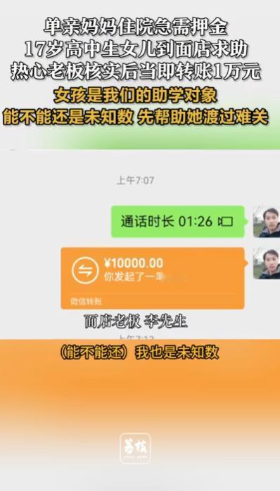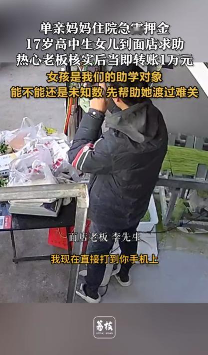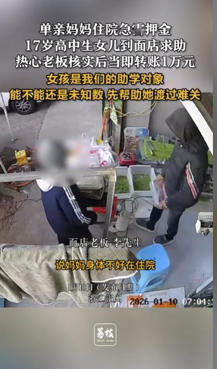 破防了!浙江,一单亲妈妈住院急需押金,17岁女儿跑到面店求助,谁知,老板明知还款没把握,依然给女孩转了10000元,老板:“先帮她渡过难关!”网友:这老板想不发财都难!   事情发生在不久前,单亲妈妈孙女士(化名)因突发疾病被紧急送医,情况比较严重,需要立刻办理住院手续并缴纳一笔不小的押金,可对这个本就拮据的家庭来说,这笔钱成了横在面前的一道坎,孙女士的丈夫早在多年前去世,家里只剩她和17岁的女儿相依为命,平日靠打零工维持生活,几乎没有积蓄。   那天,医院催着缴费,病房外的女儿急得直掉眼泪,她翻遍了手机通讯录,能借的都借过了,亲戚朋友也实在无力再帮,情急之下,女孩想起了家附近那家常去吃面的面店,母亲身体好时,偶尔会带她去那里吃一碗最便宜的素面,老板对她们也算眼熟。   女孩顾不上多想,跑到面店门口,正值饭点,店里人不算少,她站在柜台前,紧张得手指发抖,老板察觉到异常,把她叫到一旁,听完女孩断断续续的讲述后,老板沉默了一会儿,没有追问细节,也没有反复核实真假。 随后老板转身进了里屋,几分钟后出来,当着女孩的面掏出手机,直接给孙女士转了10000元,老板却很平静地说,“先把你妈妈的事解决了再说。”   后来老板解释,他知道孙女士的情况,丈夫去世多年,一个人拉扯孩子不容易,生活压力一直很大,这笔钱他也清楚未必能收回来,但在那种时候,计较这些已经没意义了,“人命比钱重要,不管以后她有没有能力还,先帮她渡过难关才是对的。”   女孩连声道谢,几次鞠躬,她说,这可能是她这辈子最难忘的一次转账,当天,孙女士顺利办理了住院手续,手术和后续治疗也得以及时展开。   事情传到网上后,很快引发了热议,许多网友被老板的做法打动,留言称“这是真正的雪中送炭”“不是每个人都能在明知风险的情况下伸手帮人”,也有人感慨,这样的老板,生意不红才怪。   也有网友评论说,“这种人,想不发财都难”,这话并不是指金钱上的立刻回报,而是一种更长远的认可,善良也许不会马上变现,但时间久了,总会以另一种方式回到生活里。 在这个故事里,没有什么令人轰动的事情,只是一个普通人,在别人最无助的时候,选择了不计算得失,或许正是这样的选择,让这家普通的面店,多了一点温度,也让很多人重新相信,善意依然存在于日常生活的角落里。 信息来源 :荔枝新闻