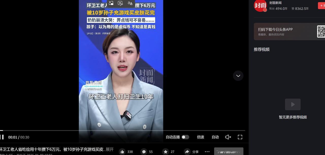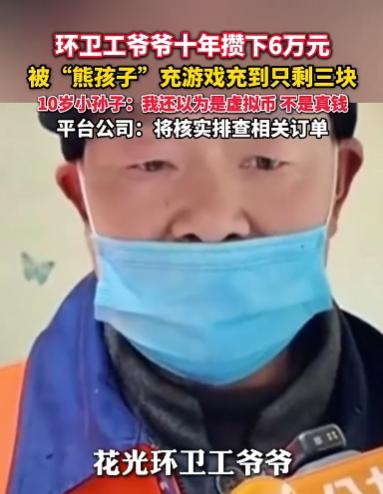 “天塌了!”近日,河南,一环卫工老人平时省吃俭用,好不容易用十年时间攒了6万元养老积蓄存到卡里,没想到近期到银行查询余额时,却被告知卡里仅剩3元,老人瞬间崩溃,经过查询才知是孙子用来充值了游戏。网友:十岁该懂事了! 对于这位环卫工老人和他的老伴来说,这6万块钱根本不是冰冷的数字,而是他们后半辈子的依靠,老人是个环卫工,每天天不亮就出门,顶着严寒酷暑在街头清扫街道,弯腰、扫地、捡废品,一天下来累得直不起腰。 老伴还身患残疾,没法干重活,家里的重担全压在老人一个人身上,日子本就过得举步维艰,这6万块钱,是老人在城市边缘靠着一把扫把一下一下“扫”出来的,是平日里连顿荤腥都舍不得吃、从牙缝里一分一毫省出来的。 在老人的心里这笔钱有着沉甸甸的意义,它是自己和残疾老伴以后看病的底气,是万一遇到急事时的救命钱,是支撑他们好好活下去的希望,他本以为把钱存进银行就安全了,等以后年纪再大些,干不动活了,就能靠着这笔钱安稳度日,可他万万没想到,自己拼了十年血汗攒下的积蓄,竟然会以这样的方式消失得无影无踪。 那天老人想着去银行看看卡里的钱,心里也踏实点,可当银行卡插进查询机,显示屏上跳出“3元”的余额时,他整个人都僵住了,一开始他还以为是机器出了故障,反复插了好几次卡,结果还是一样。 他又急忙找到银行工作人员查询,得到的结果让他如遭雷击,卡里的6万块钱,在短短五个月内,通过161笔游戏充值订单,被挥霍一空了。 老人瞬间就崩溃了,十年的辛苦、十年的省吃俭用,一幕幕在脑海里闪过,他再也忍不住,当场就蹲在银行大厅里痛哭起来,周围的人看着老人哭得撕心裂肺,都忍不住上前安慰,问清楚缘由后,也都替他感到心疼和气愤,谁能想到掏空老人养老钱的黑手,不是电信诈骗犯,也不是小偷,竟然是自己一手疼大的亲孙子。 后来大家才弄明白,这一切的源头,竟然是家里给孩子配的电话手表,因为孩子的父母常年在外打工,没办法陪在孩子身边,为了方便平时联系,家里就特意给十岁的孙子买了电话手表,可谁也没料到,这本该用来维系亲情的纽带,却成了孩子挥霍积蓄的“工具”。 原来孩子为了玩游戏,需要绑定手机号,他竟然“无师自通”地把电话手表里的SIM卡取了出来,塞进了爷爷的手机里,更让人无奈的是,不知什么时候,他还偷偷记住了爷爷的支付密码。 就这样孩子绕开了所有大人的监管,拿着爷爷的手机,一次次给游戏充值,购买皮肤、道具,在他的认知里,花的只是游戏里的“虚拟币”,只是屏幕上的一串数字,点击一下就能换来更炫酷的装备,让自己玩得更爽快。 他根本无法理解,这些“虚拟币”的每一分钱,都是爷爷在街头风吹日晒、弯腰无数次才换来的血汗钱,当老人崩溃痛哭的样子、家里乱作一团的场景摆在他面前,尤其是残疾的奶奶听到积蓄全没了的消息,当场就晕倒后,这个十岁的孩子才终于意识到自己闯了大祸,吓得哭了起来,满脸都是后悔,可再多的眼泪,也换不回老人十年的血汗钱。 这起悲剧说到底是“代际盲区”造成的,孩子是留守儿童,父母不在身边,情感陪伴缺失,很容易沉溺于网络世界带来的即时满足感,而老人不懂数字支付的风险,支付密码设置得简单,也看不懂支付提醒,相当于毫无防御能力,现在家属已经向游戏平台发起了退款申诉,平台方也回应说正在核实排查相关订单,但退款结果还不确定。 对于这个本就艰难的家庭来说,积蓄归零的那一刻,天就真的塌了。这个阴影,恐怕会在他们心里停留很久很久,这事儿传到网上后,网友们都特别无奈,除了心疼老人,也忍不住吐槽这个孩子:“都十岁了,该懂事了,知道爷爷挣钱有多不容易吗?” 还有网友说:“这学费也太昂贵了,不仅是给孩子的教训,更提醒了所有家长,不管再忙,也得给孩子做好金钱观教育,管好支付安全,不然很可能酿成大错。” 是啊对于留守儿童家庭来说,父母常年在外,隔代教育本身就有很多难题,长辈疼孩子没错,但不能忽视了对孩子的正确引导,金钱观的培养、网络沉迷的防范、支付安全的提醒,这些都不能少,毕竟孩子年纪小不懂事,但家长和长辈不能掉以轻心。一旦防线出现漏洞,付出的可能就是整个家庭的未来。 希望这起事件能给更多家庭敲响警钟,尤其是有留守儿童的家庭,一定要多关注孩子的成长和心理状态,做好教育引导,也希望游戏平台能尽快核实情况,给老人和家人一个合理的交代,尽量帮这个艰难的家庭挽回一些损失,别让老人十年的血汗白流,也别让这个十岁的孩子,因为一时的无知,背负上一辈子都还不清的愧疚。