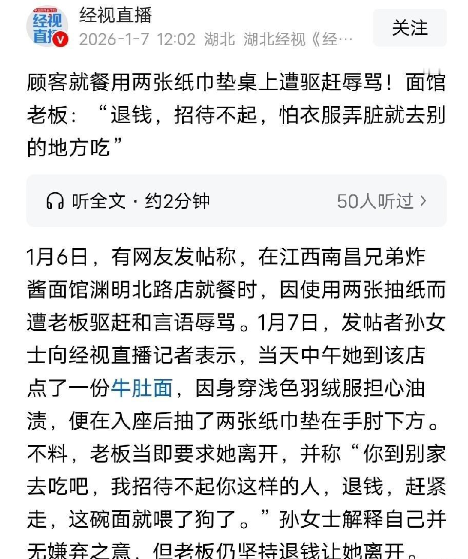 江西南昌,女子在一家面馆吃面,怕浅色羽绒服粘上油渍,就抽了2张纸巾垫在手肘下面,谁料,老板赶她离开,还说:你去别家吃,我招待不起你这样的人,退钱,这碗面就喂了狗了!女子解释,我不是嫌弃的意思,但老板坚持让她走,女子走后又觉得不对劲,回去找老板理论,老板一番话直接给女子气炸了。 冬日的午后,孙女士裹着一件干净的浅色羽绒服走进街角一家面馆,找了个靠窗的位置坐下。点餐后端上的热汤面冒着氤氲热气,她低头看了眼自己的羽绒服袖口,生怕用餐时溅上油污不好清洗,便顺手从桌旁的纸巾盒里抽出两张,小心翼翼地铺在自己手肘下方的桌沿上,轻轻抚平。这一出于自我保护的细微举动,没有丝毫恶意,却瞬间点燃了面馆老板的怒火。 正在后厨忙活的老板瞥见这一幕,猛地摔下手里的抹布,几步冲到孙女士桌前,双手叉腰,眉头拧成一团,语气冲得像带着刺:“你这是干啥?用两张纸巾垫着,嫌我这儿脏是吧?这样的顾客我招待不起,赶紧走!”孙女士还没来得及开口解释,老板的呵斥就已经引来了店内其他食客的目光,让她脸颊瞬间发烫。更令人难堪的是,在她窘迫地收拾东西起身时,老板还站在一旁低声咒骂,一句“面喂了狗”像淬了冰的刀子,狠狠扎在她心上,将一场小小的服务分歧彻底升级为人格尊严的公然冒犯。 突如其来的指责与辱骂让孙女士愣在原地,眼里满是错愕与委屈。她攥紧了手里的背包带,声音带着一丝颤抖地解释:“老板,我不是嫌脏,就是怕羽绒服蹭上油,就用了两张纸巾,没别的意思……”可她的话还没说完,就被老板粗暴地打断了:“少找借口!垫纸巾就是嫌弃!不想吃就滚,别在这儿耽误我做生意!”老板满脸不耐烦,挥手像赶苍蝇一样催促她离开,完全不给她任何沟通的余地,孙女士只能忍着眼泪,在其他食客好奇又同情的目光中,狼狈地被驱离店外。 站在面馆门口的寒风里,孙女士越想越委屈,胸口堵得发慌。她觉得自己没做错任何事,却平白遭受了一顿辱骂和驱赶,合法权益与人格尊严都受到了无端侵害。深吸一口气后,她下定决心要讨个说法,于是攥紧手机,按下录音键后重新走进面馆。面对返回理论的孙女士,老板丝毫没有收敛,反而梗着脖子,音量更高了几分,从录音里能清晰听到他急促的呼吸和强硬的语气:“我就说你嫌弃我这儿!你这种顾客,我这儿不欢迎!爱吃不吃,哪儿凉快哪儿待着去!”全程没有半句歉意,态度愈发蛮横。 满心委屈无处诉说,孙女士回到家后,翻出录音,一字一句地整理好自己的遭遇,发布到了网络平台上,希望能借助舆论力量寻求公道。帖子里,她不仅详细描述了事发经过,还附上了关键的录音片段。没想到,帖子一经发出,就像投入湖面的石子,迅速引发了网友的广泛关注与热烈讨论,相关话题很快登上了各大社交平台的热搜榜单,评论区里挤满了为她抱不平的声音。 大部分网友觉得老板反应太过度了。“两张纸巾而已,至于吗?”“顾客花钱消费,还得受这气?” 更让人意外的是,有网友留言说,自己也去过这家面馆,因为用了几张纸巾擦桌子,被老板阴阳怪气过。还有人说,见过老板因为顾客要求多加点醋,就摆脸色。 孙女士赶紧去翻看这家店的线上评价,发现果然有不少类似的吐槽。有顾客说“老板态度极差,像谁欠了他钱一样”,还有人说“再也不会去第二次,花钱买罪受”。 原来这不是老板第一次因为小事辱骂驱赶顾客。孙女士随即向市场监管部门投诉了这家店。可监管部门的回复,却让她有些失望。 接到孙女士的投诉后,市场监管部门很快联系了她,也去面馆调查了情况。经过核实,确认了老板确实辱骂驱赶了孙女士。 可监管部门的处理结果,却超出了孙女士的预期。工作人员告诉她,因为老板已经把面钱退给她了,这件事更多是“服务态度问题”。 他们会对老板进行批评教育,让老板注意服务态度,但很难强制老板向她道歉。毕竟没有造成严重的后果,达不到行政处罚的标准。 孙女士很无奈,她要的不是退款,而是一个道歉。自己的人格尊严受到了侵犯,难道就只能这样不了了之? 随着事情的发酵,网友们分成了两派,争论得越来越激烈。支持孙女士的人占了大多数,觉得老板太过分。 有网友说:“纸巾本来就是给顾客用的,两张又不多,老板这是故意找茬吧?”“顾客花钱消费,还得看老板脸色,这是什么道理?”还有人说,自己去面馆也会用纸巾垫一下,就怕弄脏衣服。 也有少数网友站在老板这边,觉得孙女士有点矫情。他们说,小本生意不容易,纸巾也是成本,老板可能是心疼成本才生气的。 还有人说:“虽然老板骂人不对,但顾客用纸巾垫手肘,确实有点像嫌弃店脏。有话好好说,没必要闹这么大。” 对此想问大家,你觉得孙女士用两张纸巾垫衣袖过分吗?老板的做法又对不对?如果是你遇到这种事,会怎么处理?欢迎在评论区留言讨论。