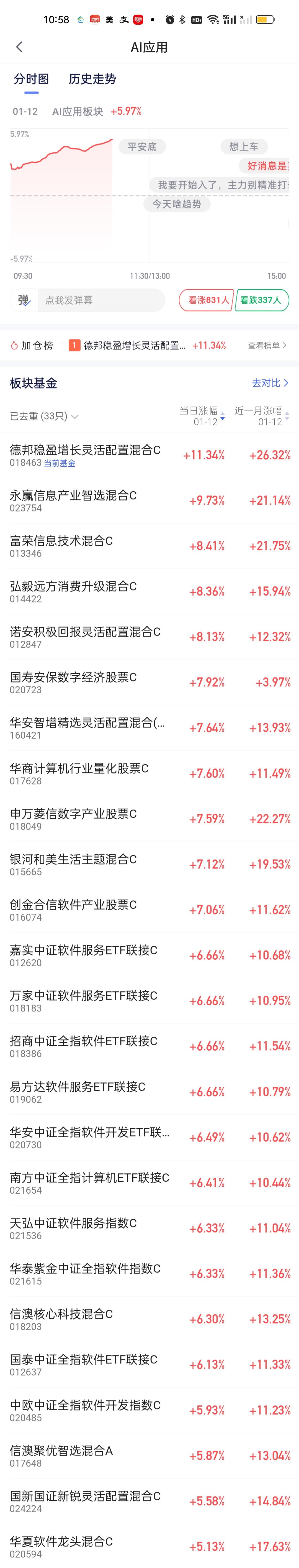 昨天晚上才写了AI应用的文章,并且写了多篇文章让大家多多专注AI应用端。没想到话音未落,AI应用今天早上就彻底爆了,涨幅甚至要超过商航。 现在不要再把目光盯着25年涨得好的基金了。要把眼光转向当下,转向将来。稳盈今天的涨幅可以说破纪录了,要知道它上周五才刚刚涨了9.24%,它的前十大重仓股里面有多只个股是可以涨20%的,所以今天的爆发一点都不意外,再次恭喜重仓拿着AI应用的好朋友们。今天吃大肉!